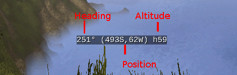 *) Displays current player heading as a standard navigation route, position in 'standard' geographic coordinates (N E) and block altitude: