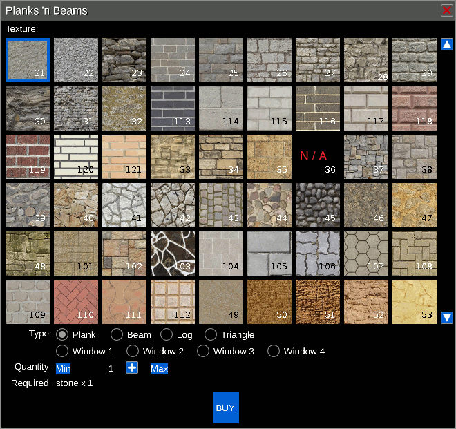 *) Selection of Plank, Beam, Log, Triangle and the 4 type of window frames.