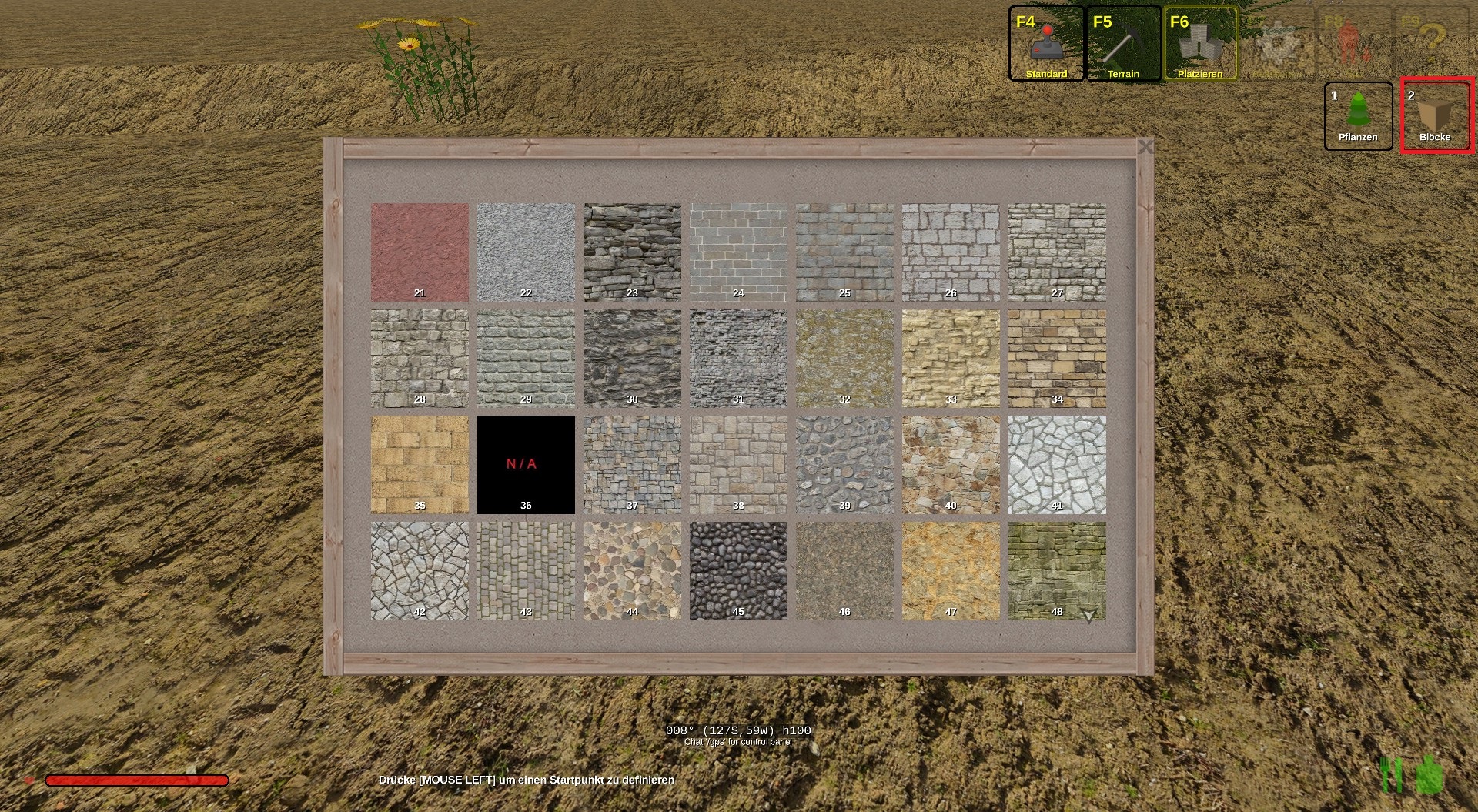 Hier mal für alle Spieler die Probleme haben mit Pflanzen oder Blöcke setzen. Die Taste (F5) können damit nur das Gelände verändern. Mit der Taste (F6) können unter Taste (1) Pflanzen setzen. Dabei gibt es zwei Möglichkeiten der Pflanzenauswahl, entweder die Pflanzen aussuchen mit dem Mausrad, oder (I) drücken dann geht ein Jurnal auf wo alle Pflanzen zu sehen sind, die Auswahl erfolgt durch drücken der linken Maustaste. Will man Blöcke setzen muß man die Taste (F6)drücken. Drückt man dann die Taste (I) geht ein Jurnal auf und zeigt alle Blöcke die man setzen kann. Mit der linken Maustaste markiert man den Block der gesetzt werden soll. Durch gedrücktes halten der linken Maustaste können nun Bereiche nach belieben ausgewählt werden wo die Blöcke gesetzt werden sollen, rechte Maustaste setzt dann die Blöcke.