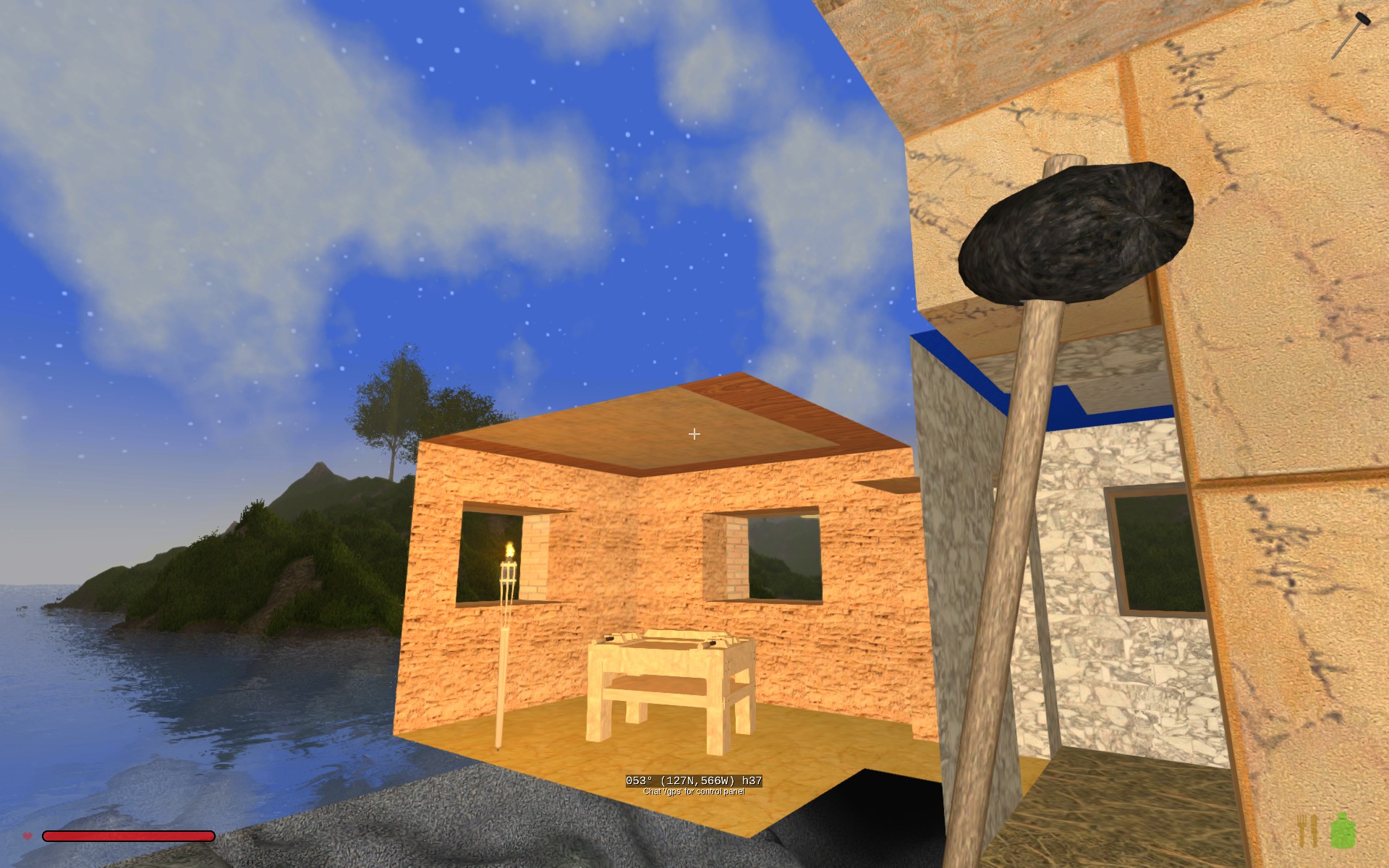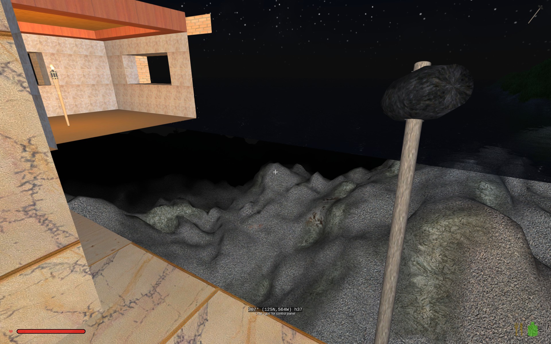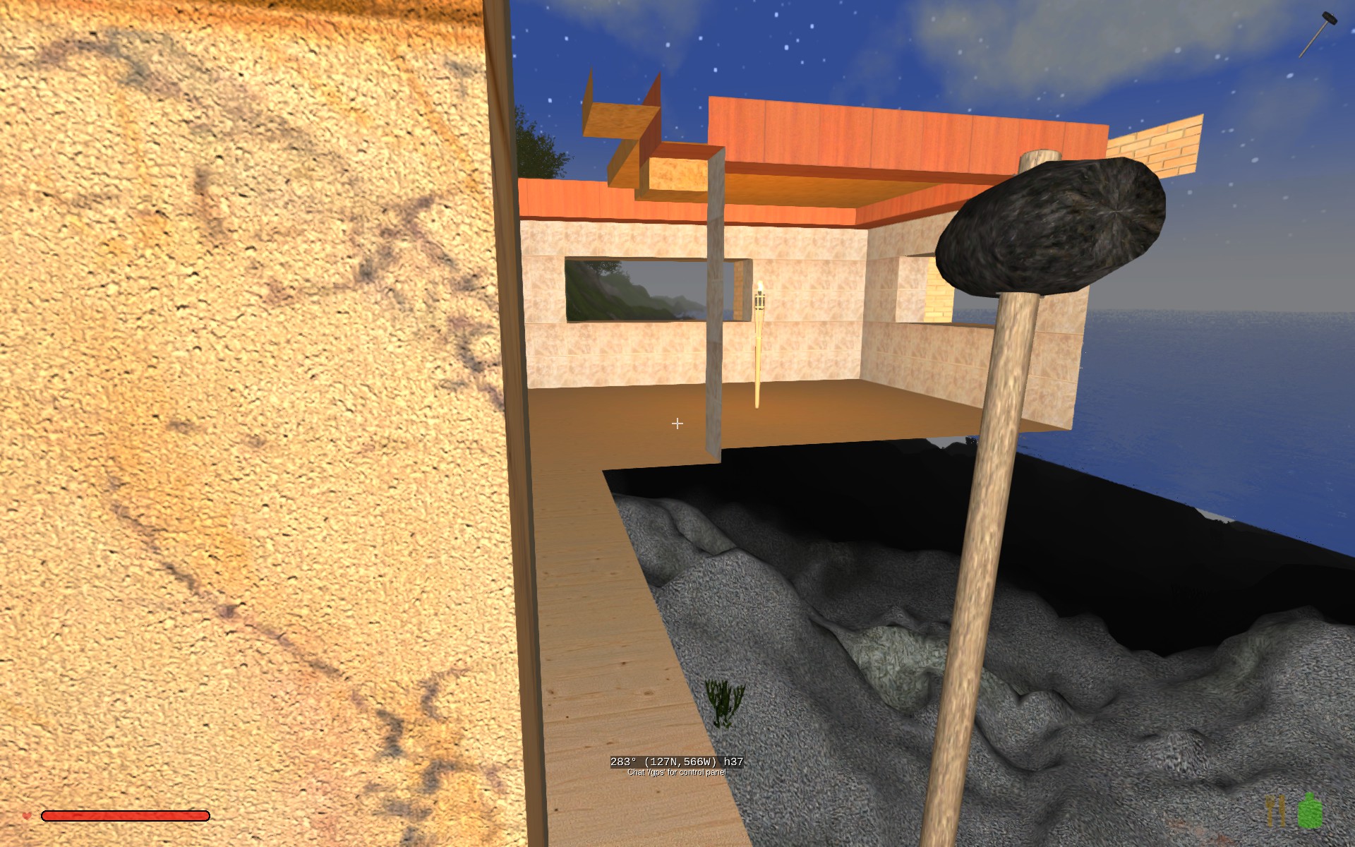 Ich wollte einen Block, der wie oben beschrieben zusätzlich gesetzt wurde, mit dem Vorschlaghammer entfernen und fand mich plötzlich im Wasser tauchend vor. War ich doch glatt durch den Boden meines Hauses gefallen. Als ich wieder auf dem trockenen war, bot sich mir ein mystisches Bild. Nach dem Neu-Laden der Welt, war alles wieder in Ordnung!