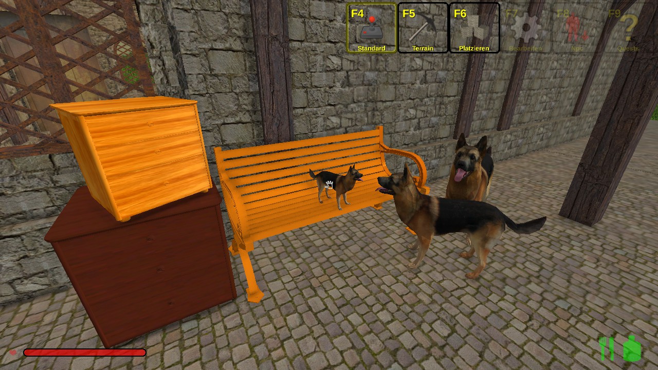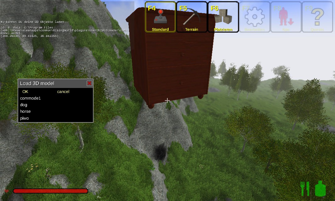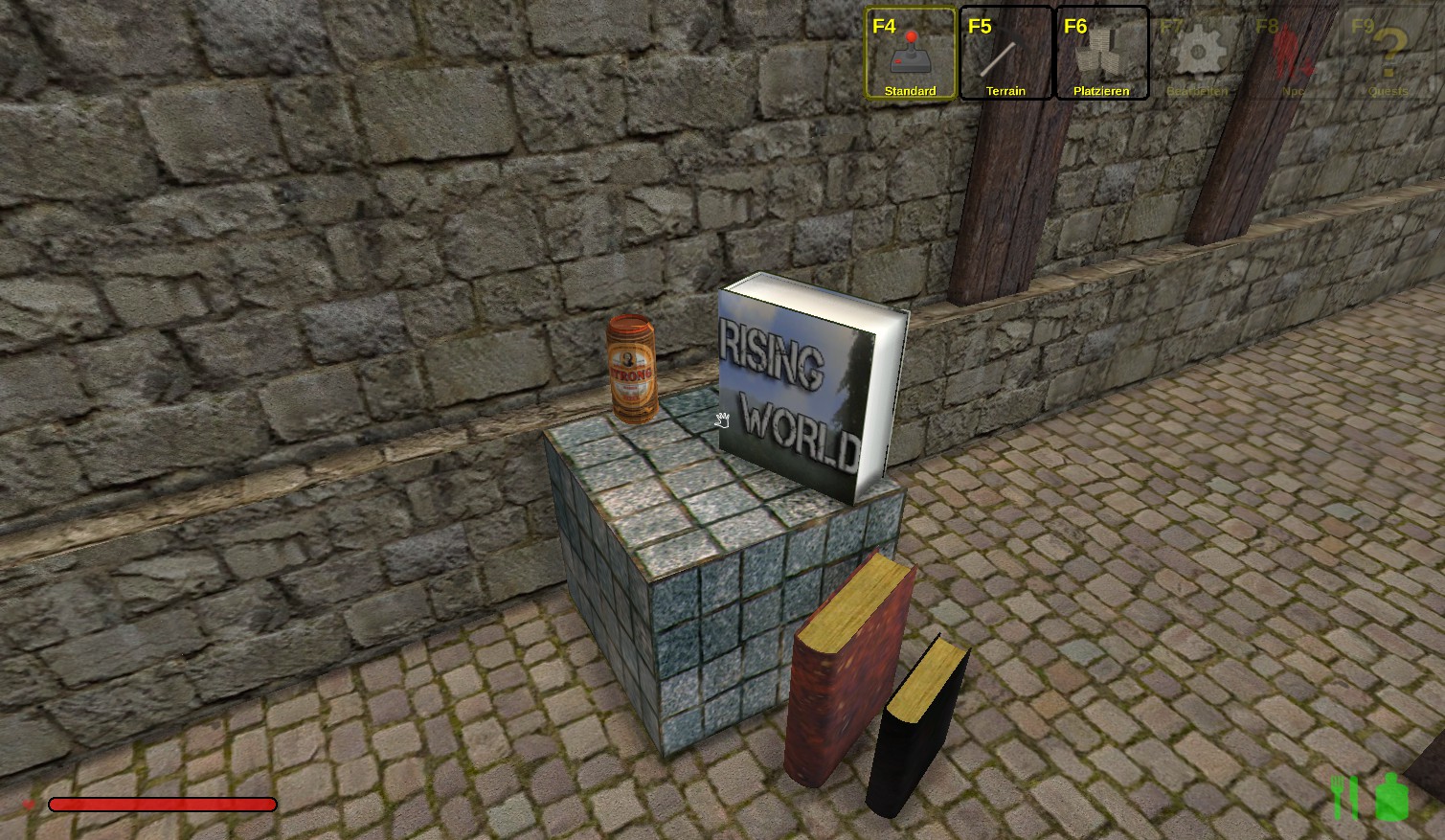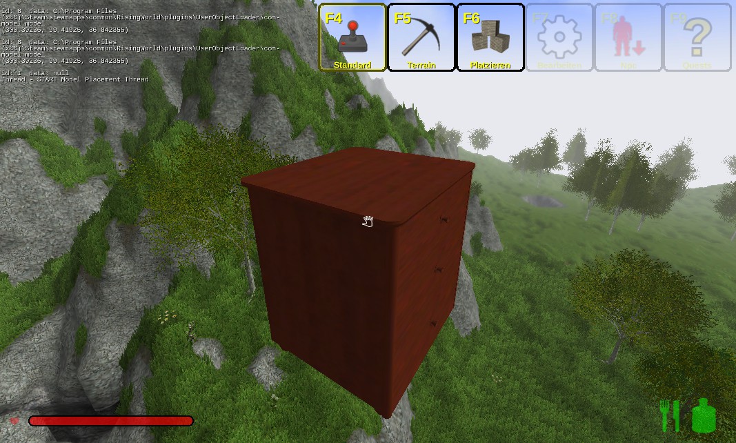-> Objekt kann noch mit Tasten bewegt und gedreht werden. Nach 2ten mal P wird es "endgültig" positioniert. Mit Taste F ist Interaktion möglich.