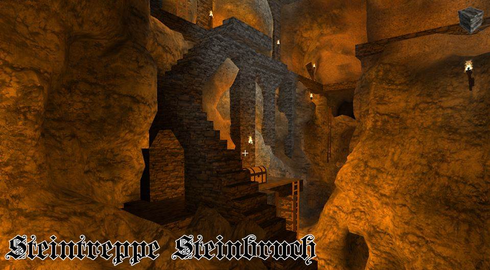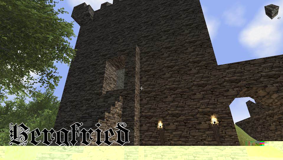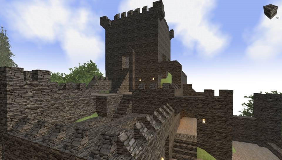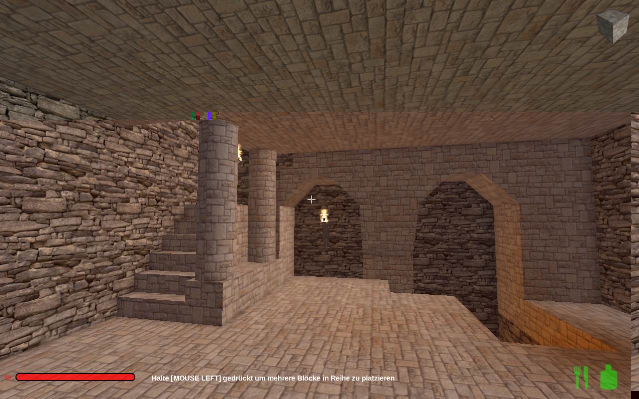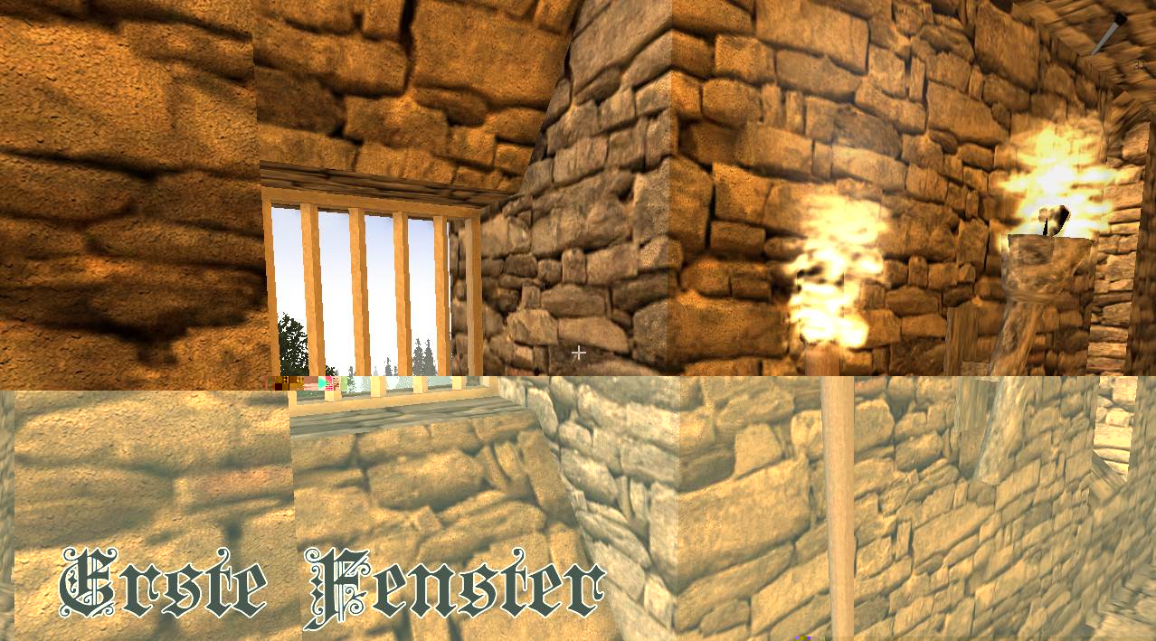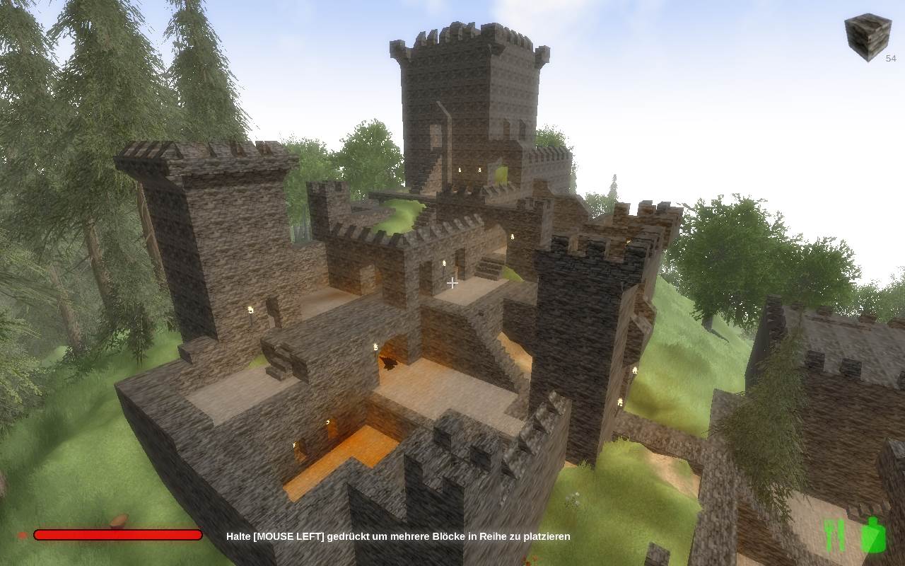In der letzten Nacht, wurde die Kaverne, die durch den Abbau für die Burg entstand, angefangen in eine große Halle umzubauen, Säulen gestützt die hohe Decke, kreative Vollmondnacht genutzt, da ich mir eh Gedanken machen musste, wie die Oberburg aussehen soll und kann, dort hab ich das obere Torhaus gebaut, die Vorburg ist noch im Bau, die Türme müssen noch begehbar werden, im Innenhof sprießt das Gras.