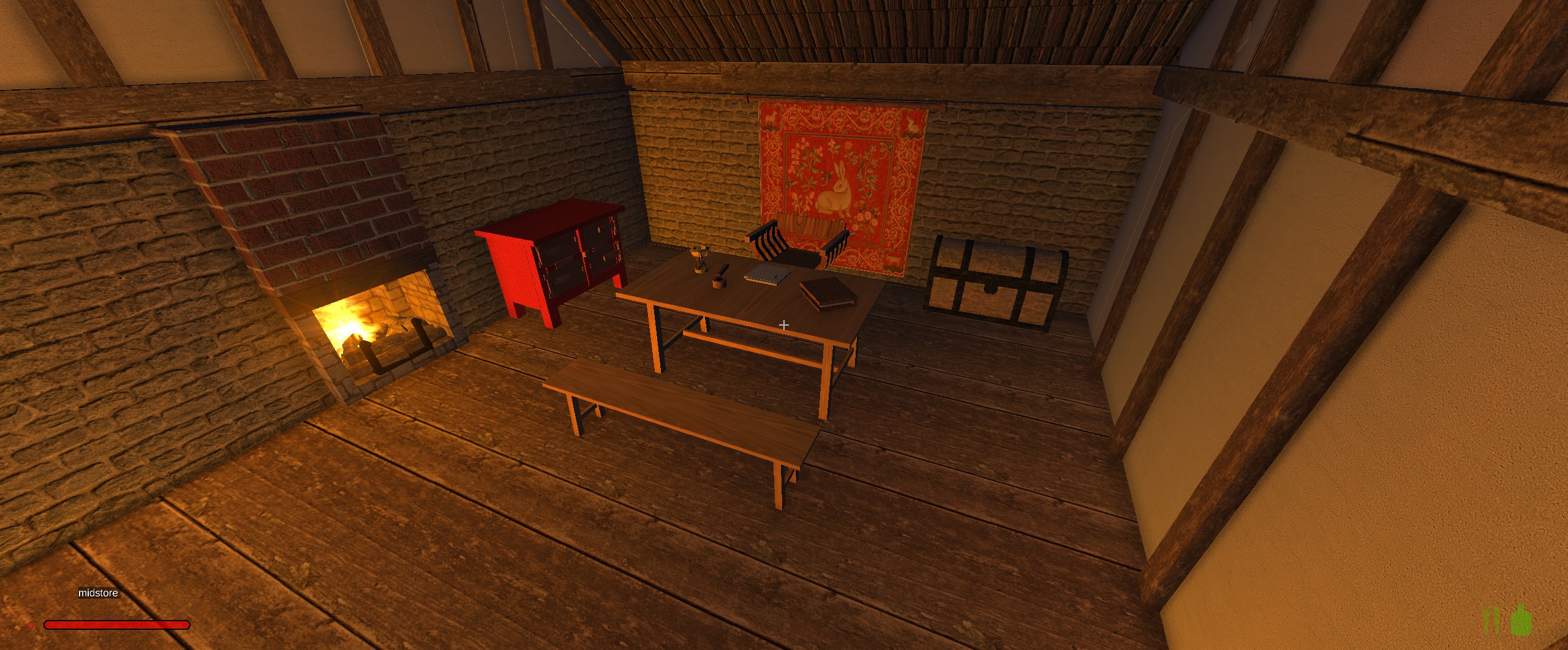 • This is my Medieval Merchant's house. I put a wine cellar in it. I went to the trouble of making bottles and racks but they were not invented until the 1700s so maybe you might want to take the out to be authentic. There is a chestbox hidden in the chest box in the office upstairs. There are also some smalls I created for ambience. The bed [slightly modified] and rug rack are from other artists as is the front light structure [slightly modified]. ** This Blueprint requires some underground space for cellar.