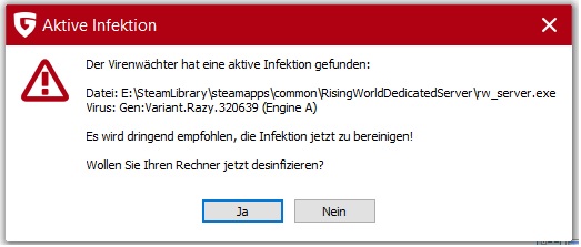 ich wollte heute mal den Dedicated Server wieder an laufen bringen und Gdata verweigert den Zugriff da es angeblich ein Virus ist.