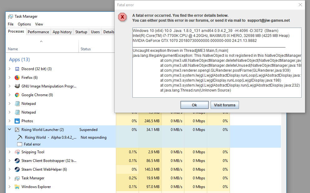 Thanks for posting the error message! This error seems to occur sporadically, it already happened before the latest update... however, we've uploaded a possible fix for this. It's available as beta branch. To enable it, rightclick on RW in Steam -> Properties -> Betas -> select "hotfix - native object mgr". You can still play on public servers with this version btw.