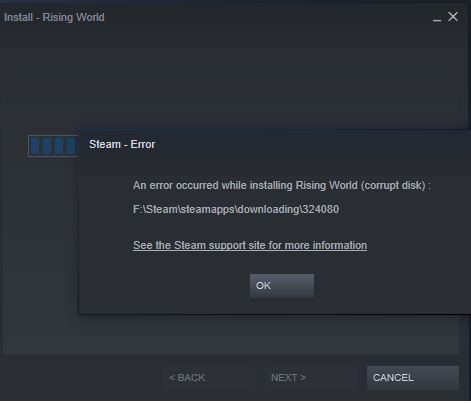 When I uninstalled then tried to reinstall Rising World, Steam gave me the same error message! I am not sure about the "corrupt disk" part. I installed other games before I tried to update Rising World and didn't get any error messages! I am using a 500GB SSD Hard drive if that helps any!
