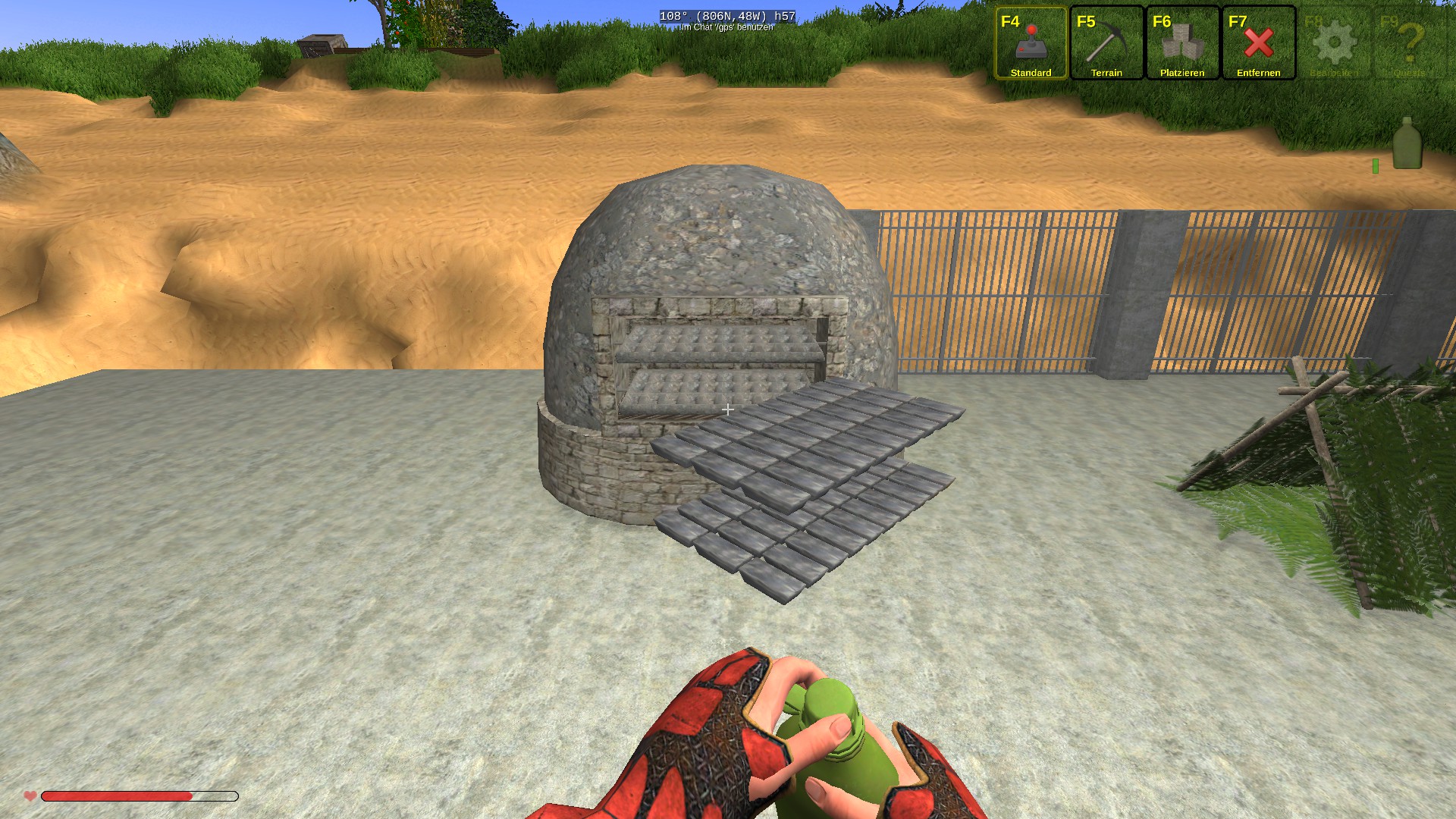 Mit einer Blaupause habe ich mir dann eine kleine Hütte gesetzt, die ebenfalls dauergezittert hat. Ich habe extra darin geschlafen, um den Spawn neu zu setzen und vielleicht so Abhilfe zu schaffen, das Zittern blieb. Auch Ausloggen und neu einloggen hat am Zittern nichts geändert.