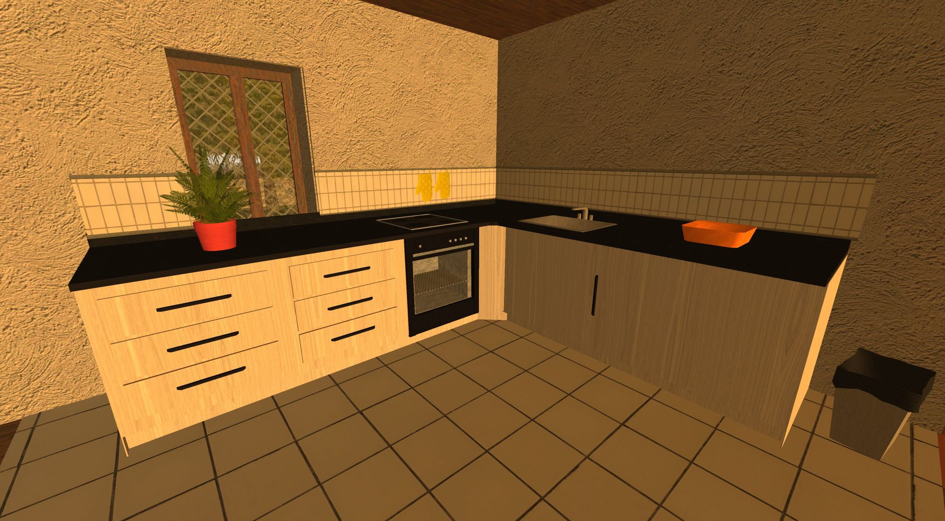 Da ich für mein Cottage eine Küche gebraucht hatte, habe ich die Standardküche aus dem Spiel aufgepeppt. Die Id ist 84, also sehr helles Holz.