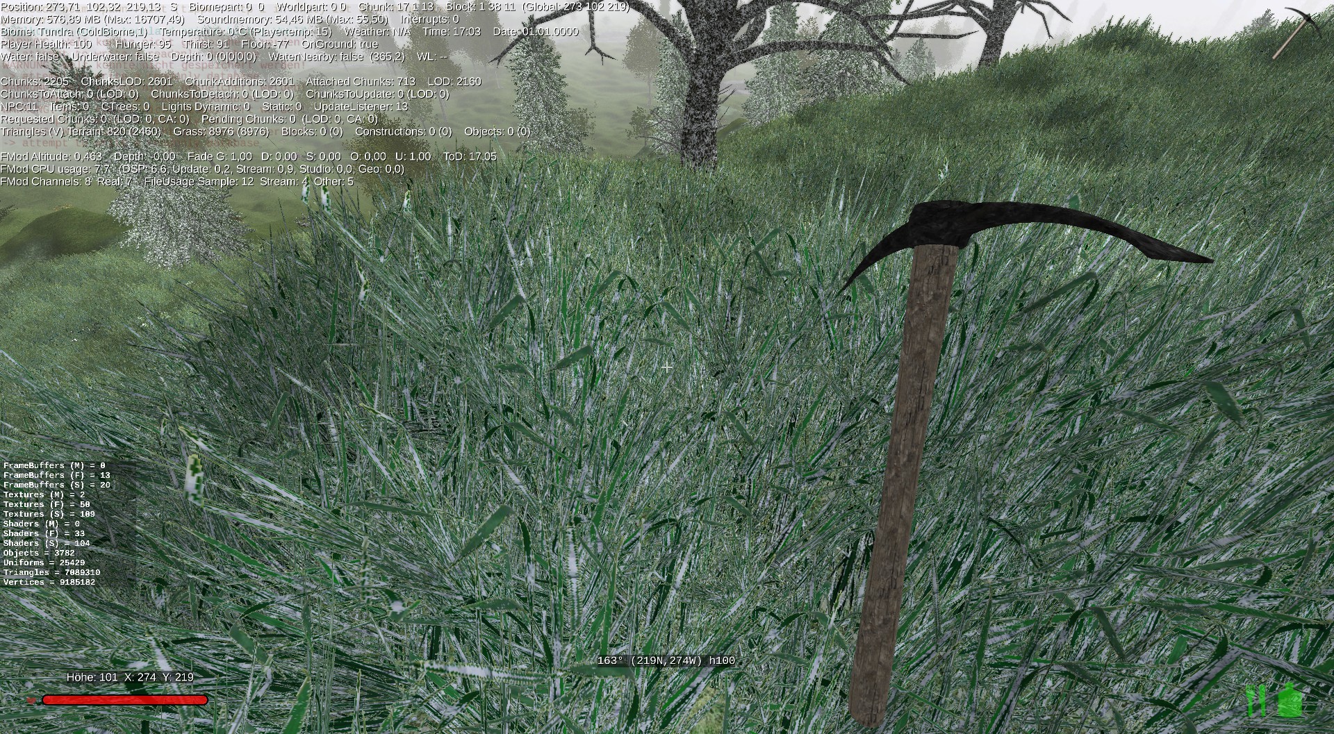 Beim Platzieren von Blockreihen oder von Construction Elementen (Planken etc) wird Gras nicht entfernt, sondern lediglich davon verdeckt - sofern diese Option aktiv ist