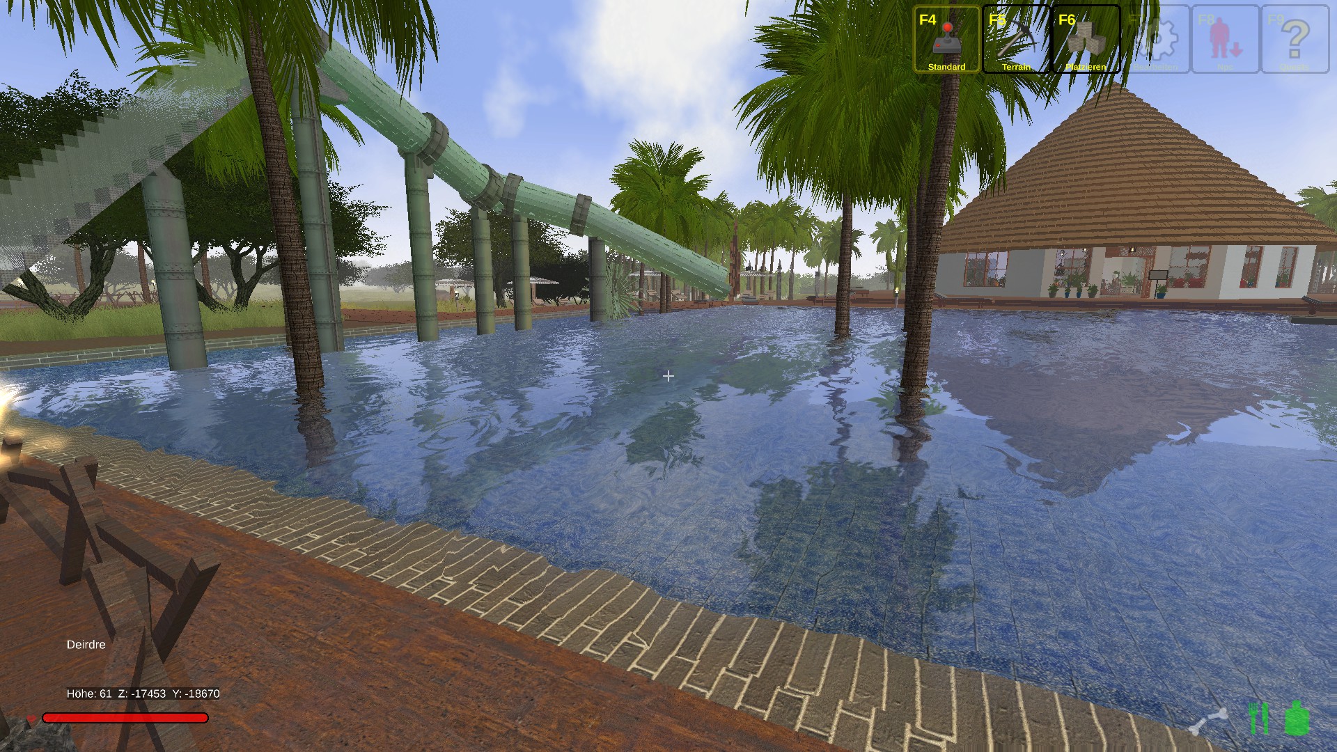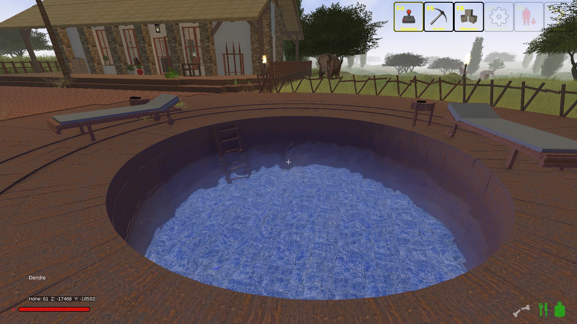 Ich habe meinen Riesenpool in der Safari Lodge mit Wasser gefüllt und die kleinen Pools versucht aufzufüllen. Das Ergebnis ist nicht das, was ich mir sovorgestellt habe. Das Wasser ist zu hoch geraten und bildet eine Bubble. Ich entferne das überschüssige Wasser entweder mit F5 das Wasser oder indem ich Erde auffülle, ich habe ja das Glück das Terraintool benutzen zu können. Aber was machen denn andere Spieler in diesem Fall? Gibt es da eine andere Möglichkeit? Remove water geht ja nicht. Und die Wasserfläche um eine Stufe nach unten zu verlegen geht ja leider auch nicht.