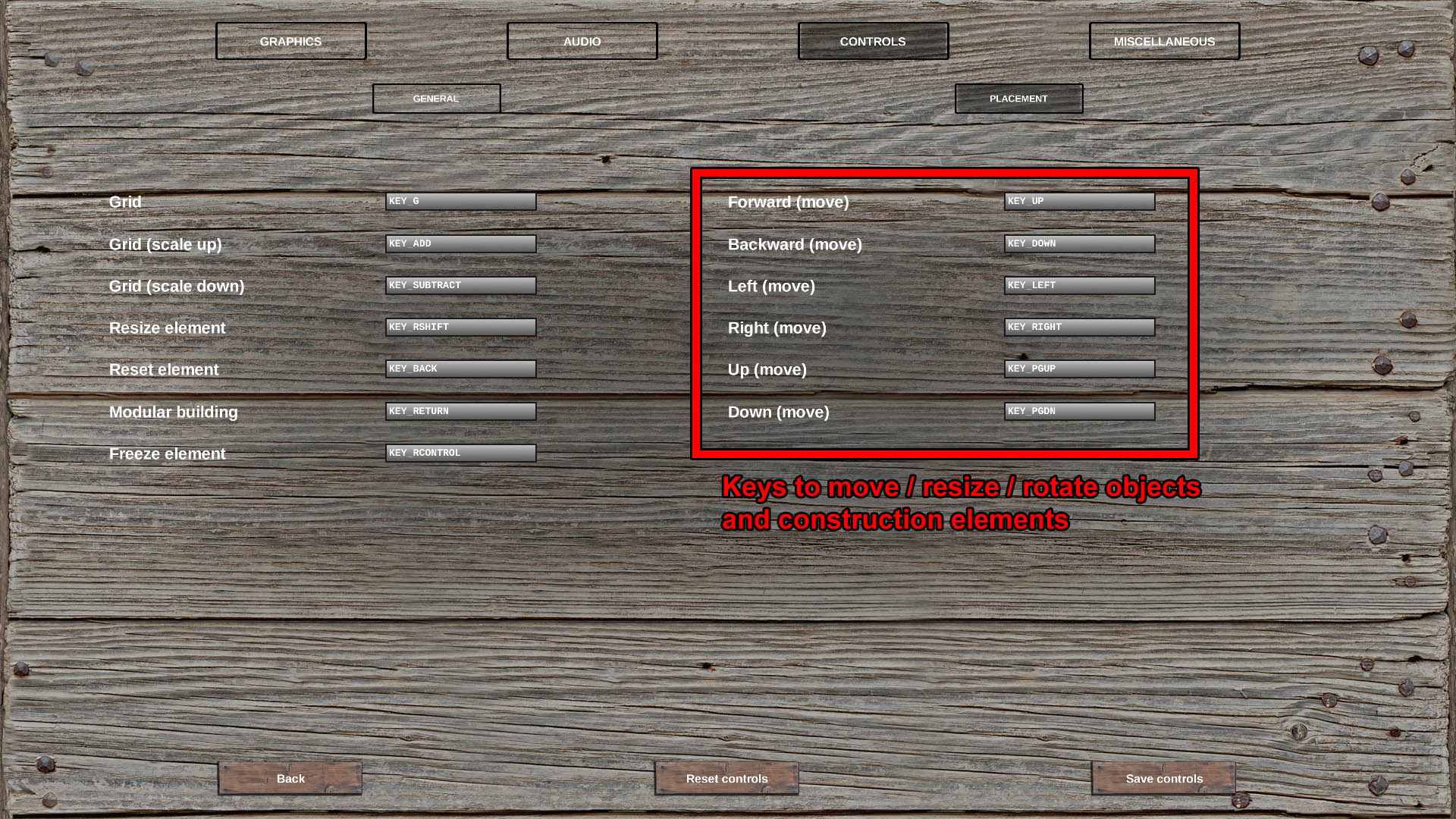 Did you check out the images I've posted? You have to go to the Placement tab in the controls settings to change the controls for moving/resizing/rotating construction elements (please see my previous post) -