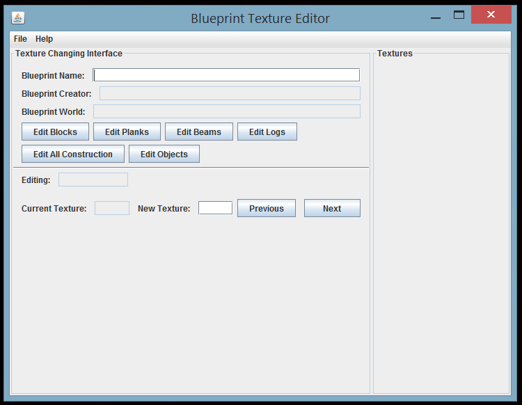 My program currently looks like this (on the left hand side you find the editing interface while on the right hand side I will include a thumbnail list of all available textures with their respective in game numbers):It has two options under the File menu i.e. Open for opening a blueprint file for editing and Save for saving the new blueprint file. Once you open a file the fields "BP Creator", " BP Name", and "BP World" show the respective information but you are only allowed to change the name field.