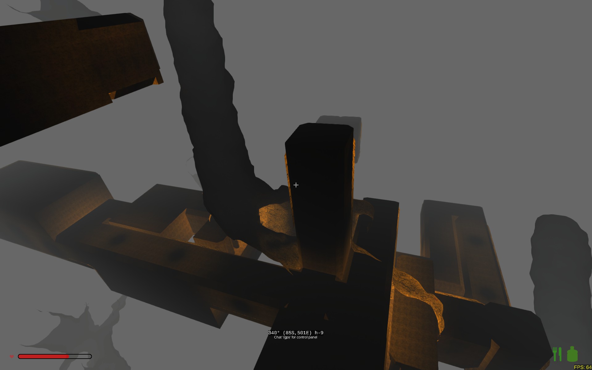 Ich wollte einen Block, der wie oben beschrieben zusätzlich gesetzt wurde, mit dem Vorschlaghammer entfernen und fand mich plötzlich im Wasser tauchend vor. War ich doch glatt durch den Boden meines Hauses gefallen. Als ich wieder auf dem trockenen war, bot sich mir ein mystisches Bild. Nach dem Neu-Laden der Welt, war alles wieder in Ordnung! -