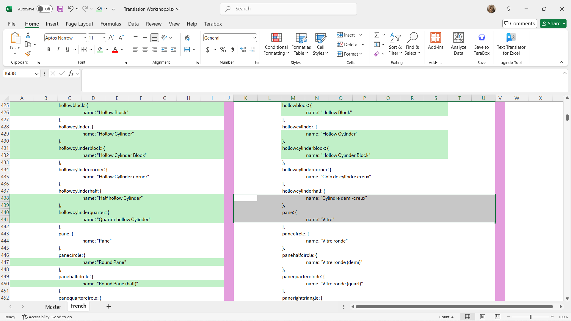 These are then copied over to the French side of the spreadsheet.