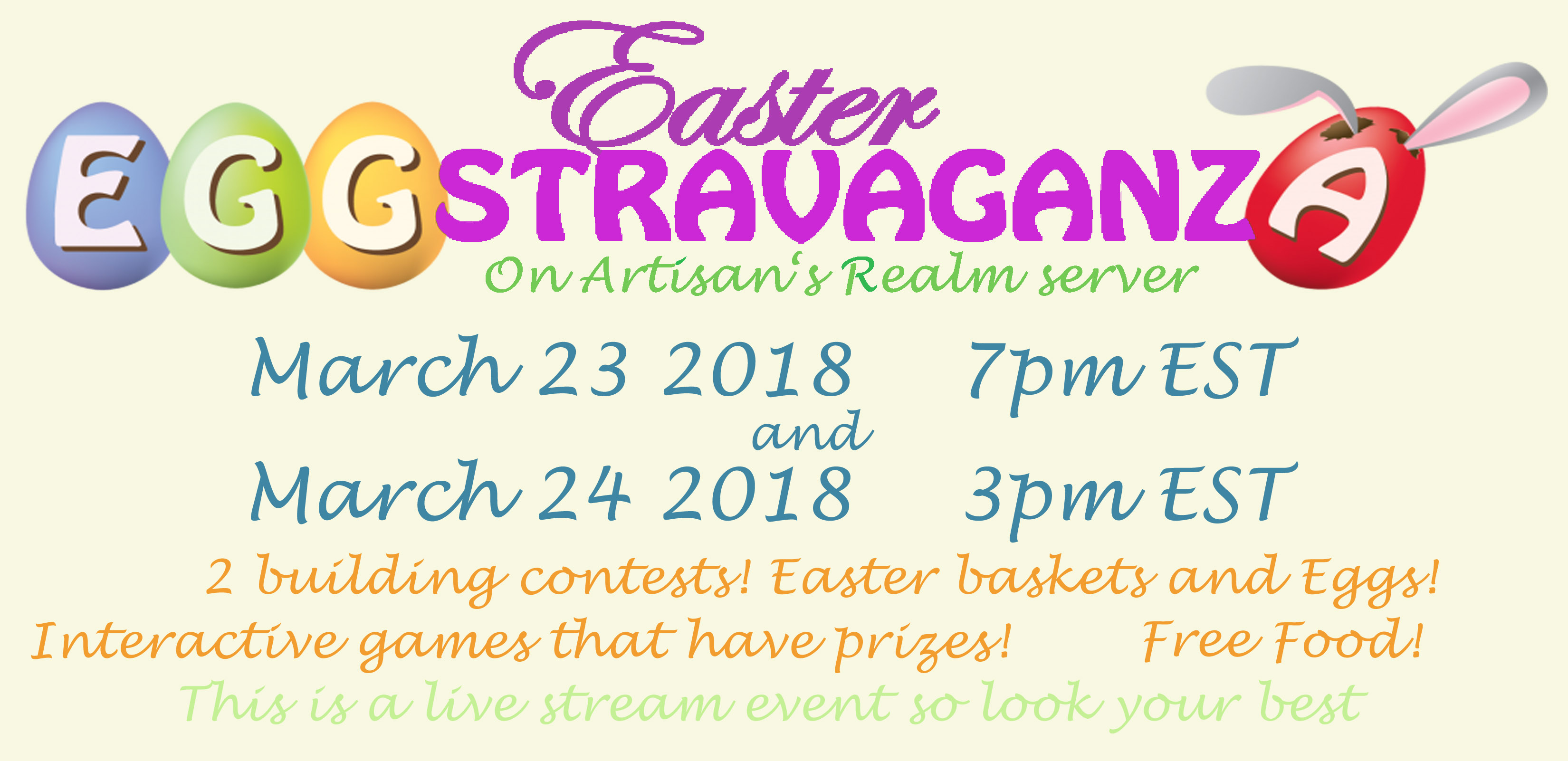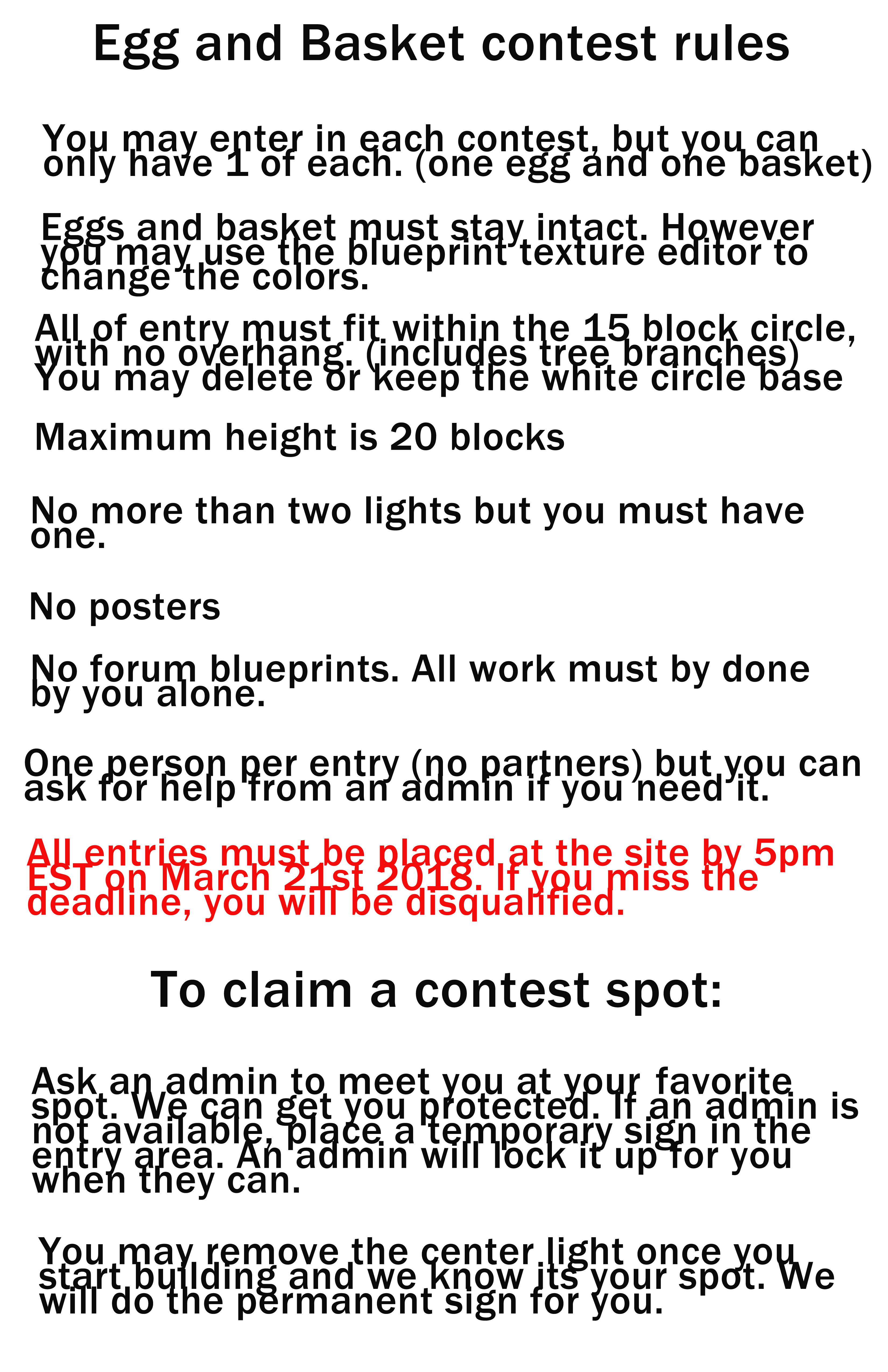 We now have the eggs and baskets set out for you to blueprint and decorate! The full list of rules is listed at the party site. All entries must be completed by March 21st so please hurry and contact an admin to reserve your spot!