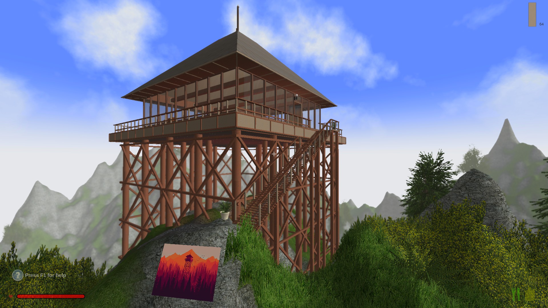 Cabin: inspired by Firewatch JMarston Apr 14th 2017 Not an exact replica, but in the theme of Delilah's cabin from Firewatch.(This is my first time doing a Blueprint. If I did something wrong, please let me know and i'll do my best to correct it.)