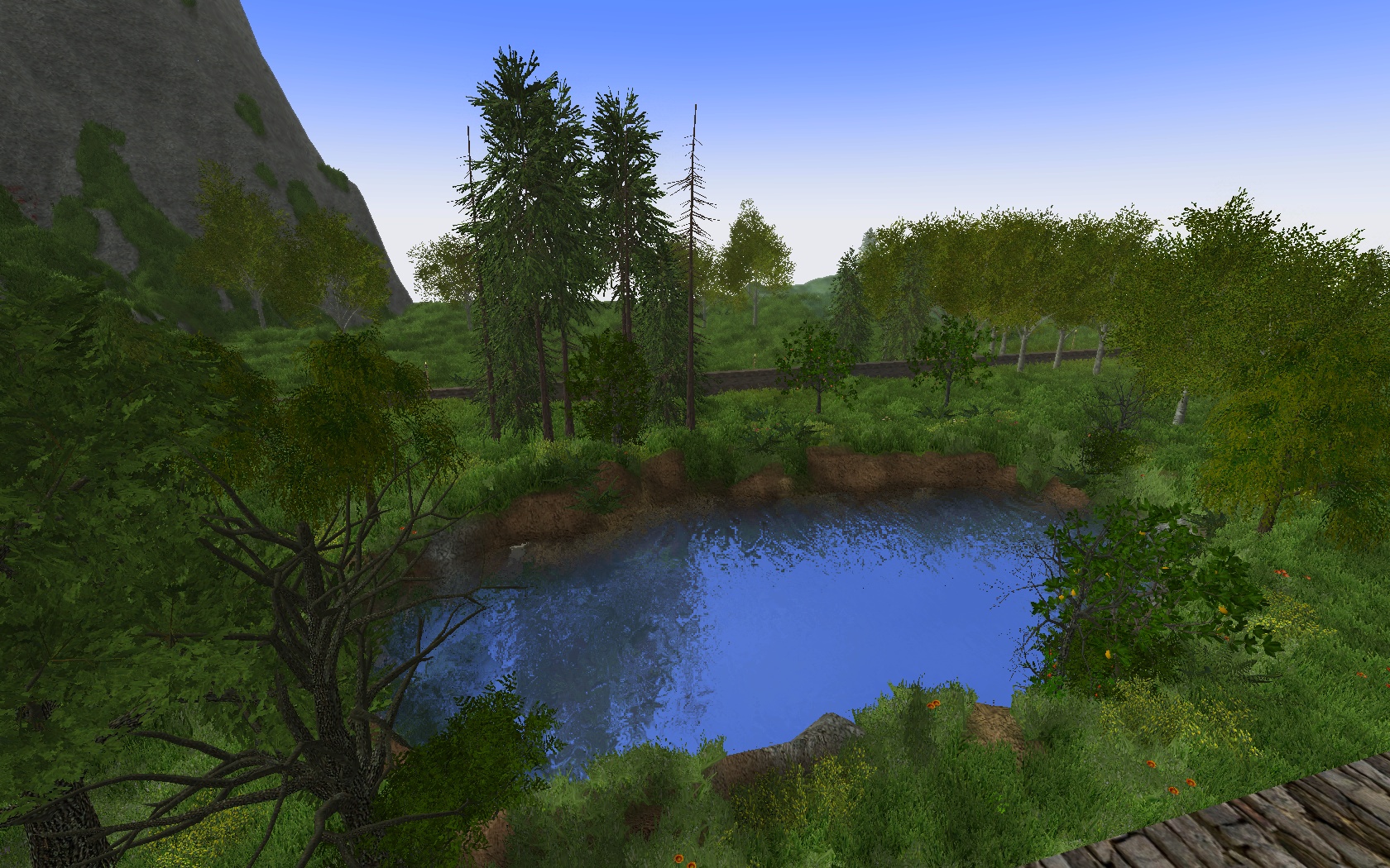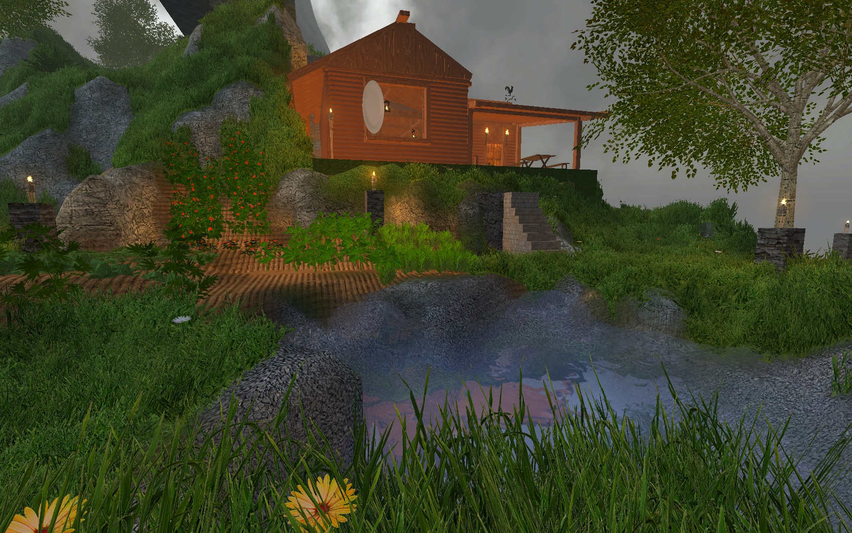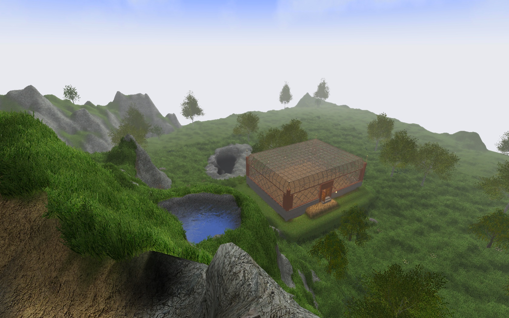 This is my first build: cabin, green house, bridge. I did a lot of terraforming here to keep the natural background incorporated.