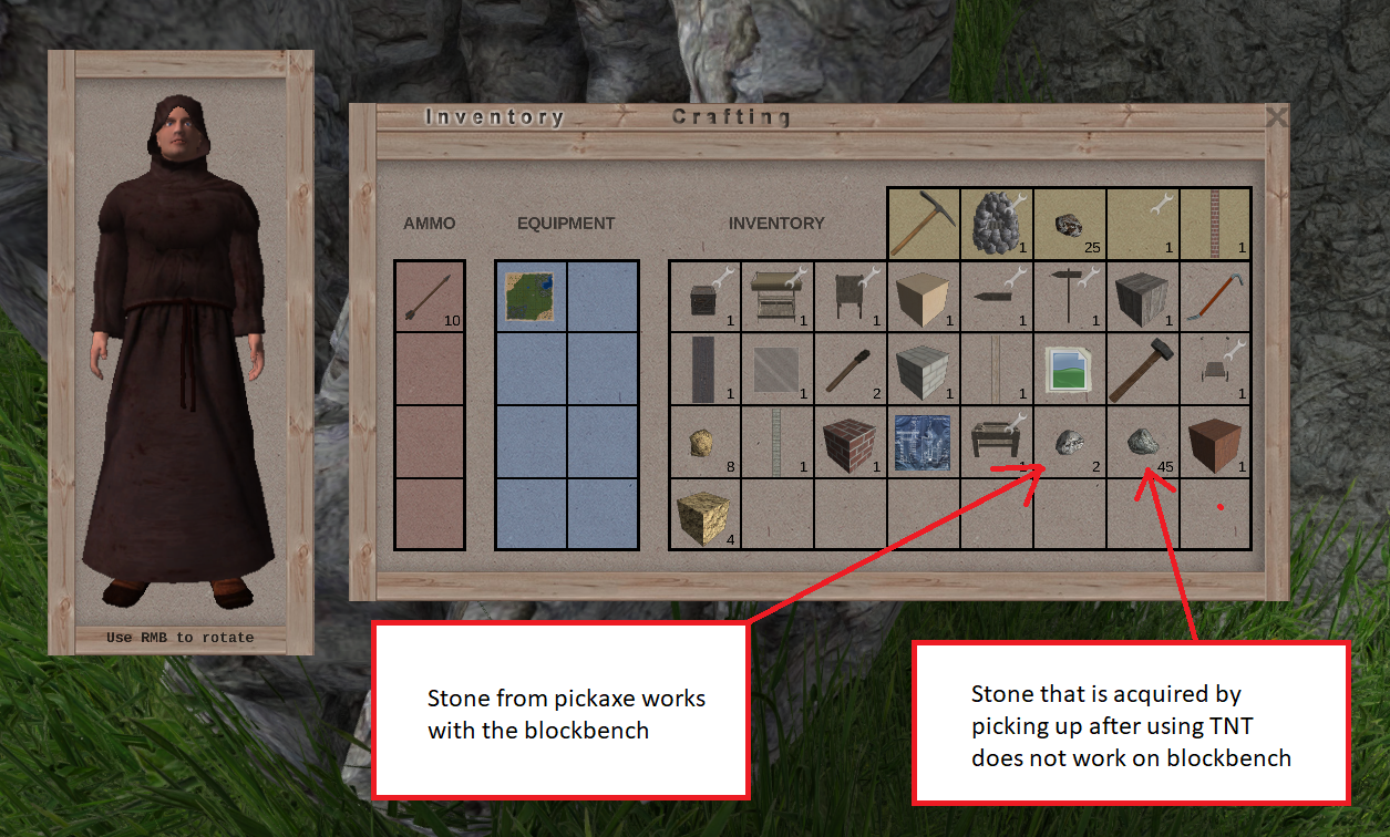 Dirt seems to work and so too does the ores (I haven't tried them all, but the ones I have tried do seem to work) however the rock appears to be a slightly different icon. I'm guessing it's missing some attribute when added to the inventory?