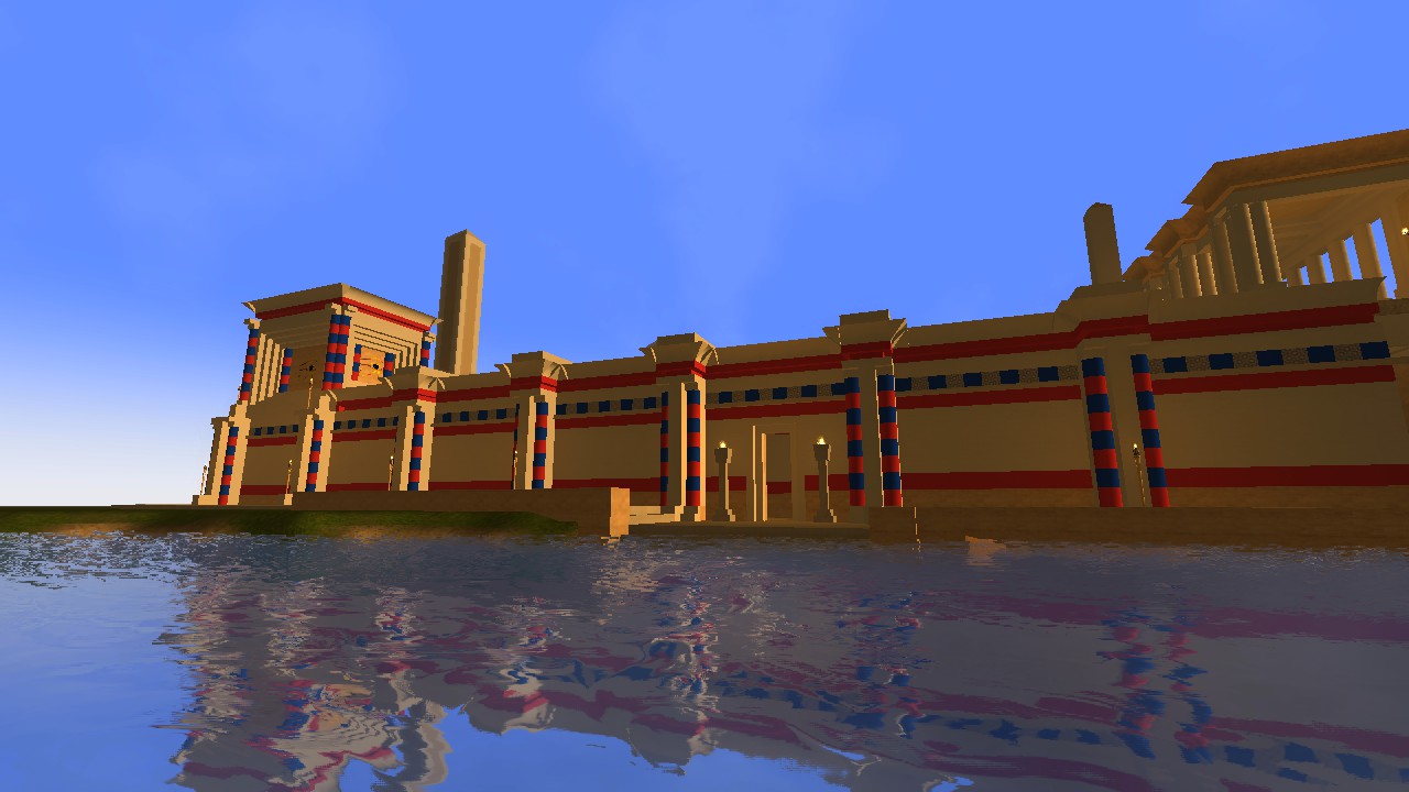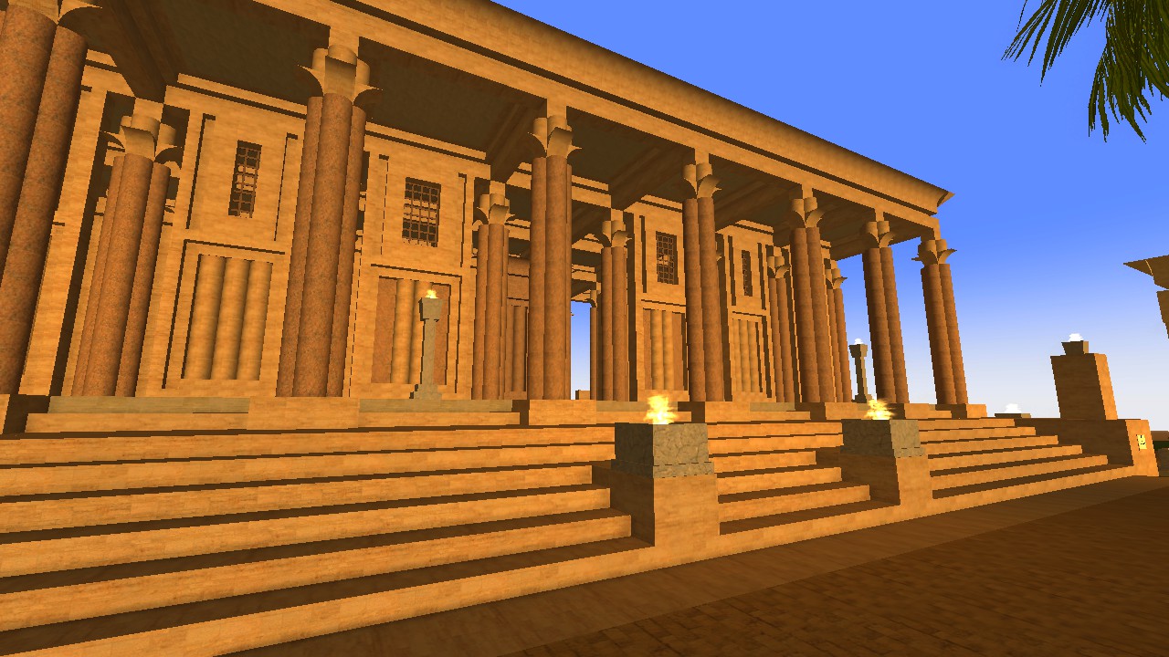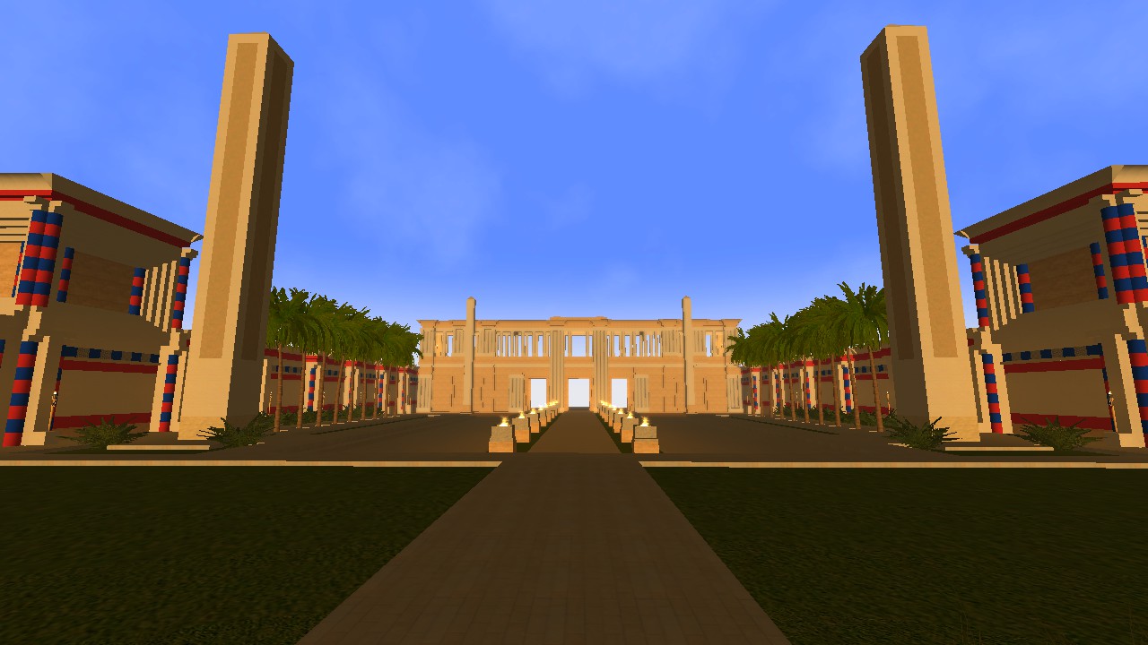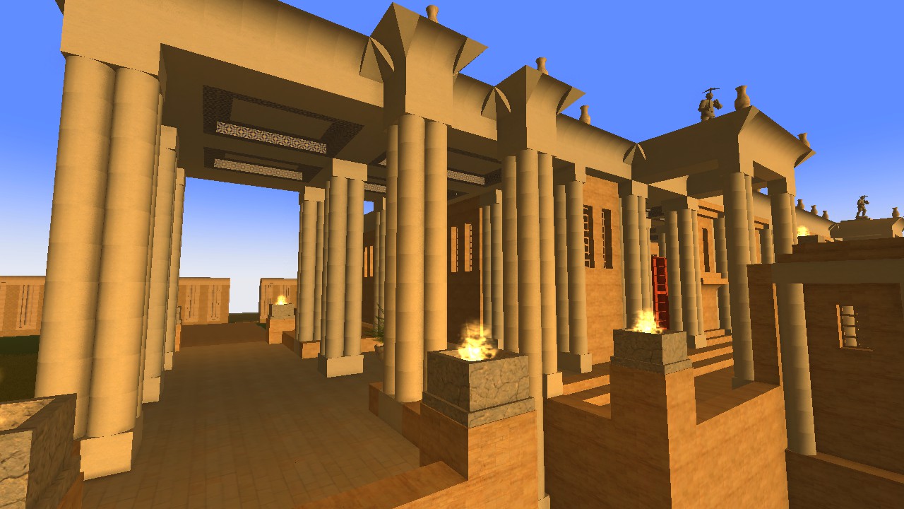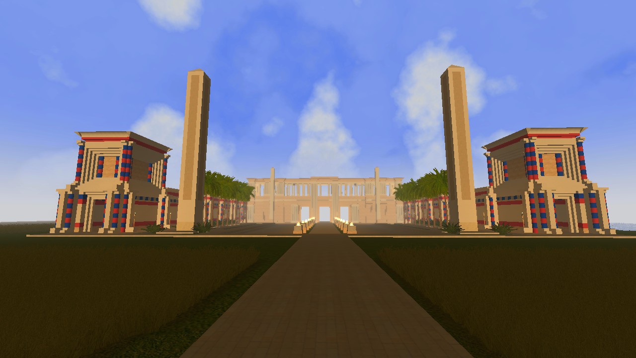 The new palace will have a great open front courtyard with a grand gate that leads to another inner courtyard which borders the palace. So far, I completed the open courtyard and the gate. I also did what I should have done A LOT earlier in this city: I started using bright red and blue coloured blocks... because the ancient Egyptians usually did paint their temples and other buildings. This will make the new royal palace stand out :thumbsup: