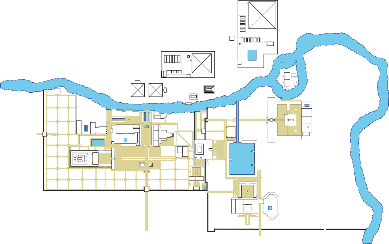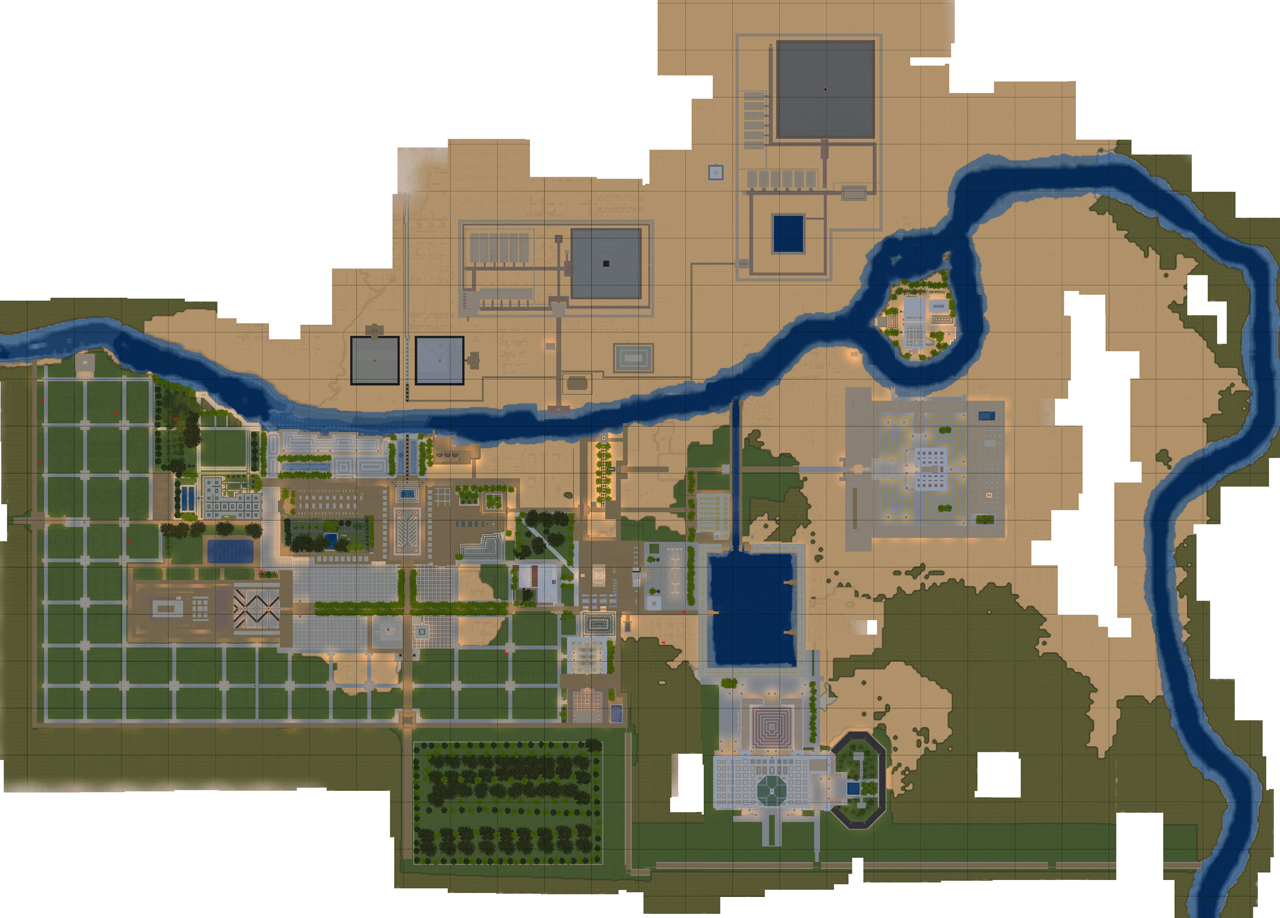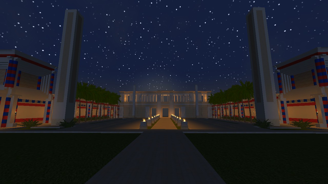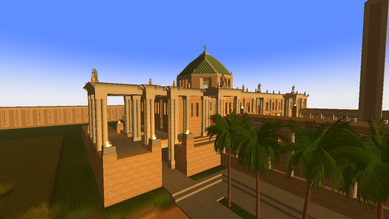 The new palace will have a great open front courtyard with a grand gate that leads to another inner courtyard which borders the palace. So far, I completed the open courtyard and the gate. I also did what I should have done A LOT earlier in this city: I started using bright red and blue coloured blocks... because the ancient Egyptians usually did paint their temples and other buildings. This will make the new royal palace stand out :thumbsup: