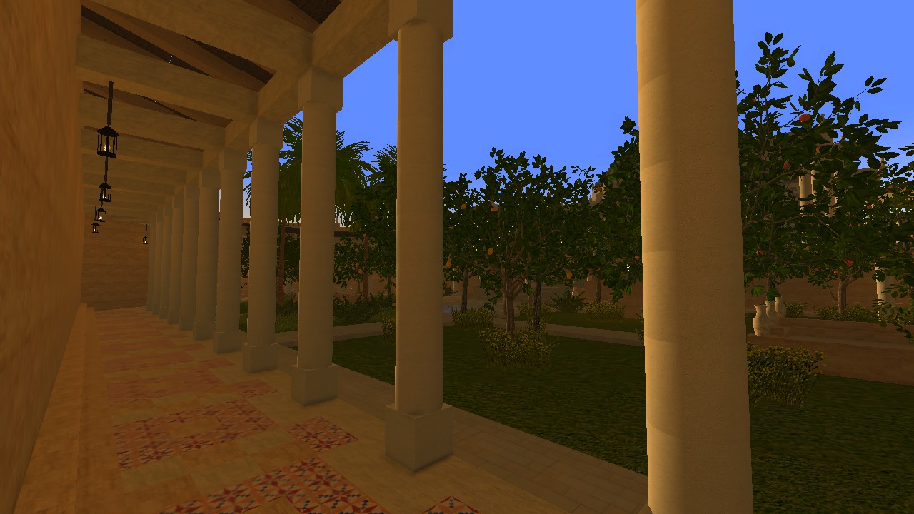 On the north side of the library is a long terrace. This can be reached from inside the library with a bridge across the streets. The meaning of this is to connect the library with an enclosed fruitgarden, so the scholars, copyists, illuminators and writers may take a break within the library-grounds but without being confronted with the hastle of the city ;-)