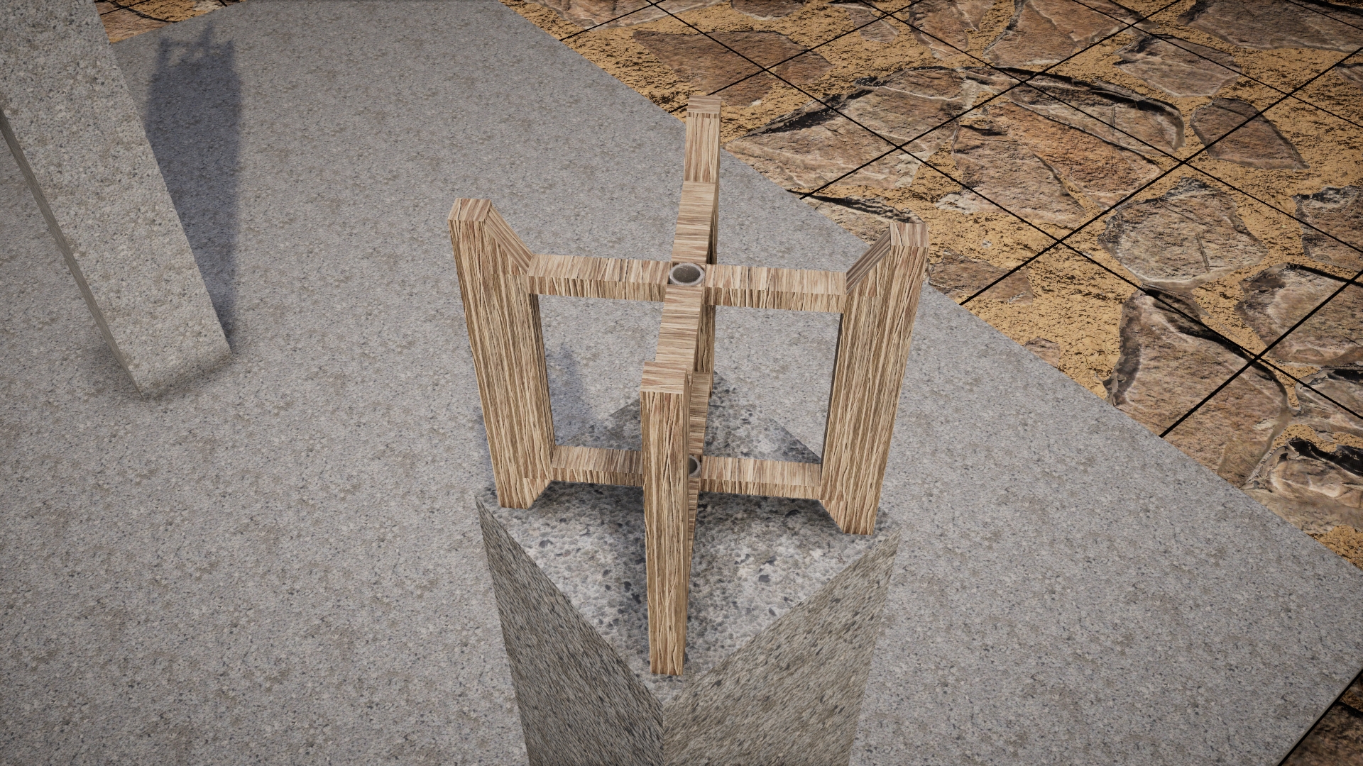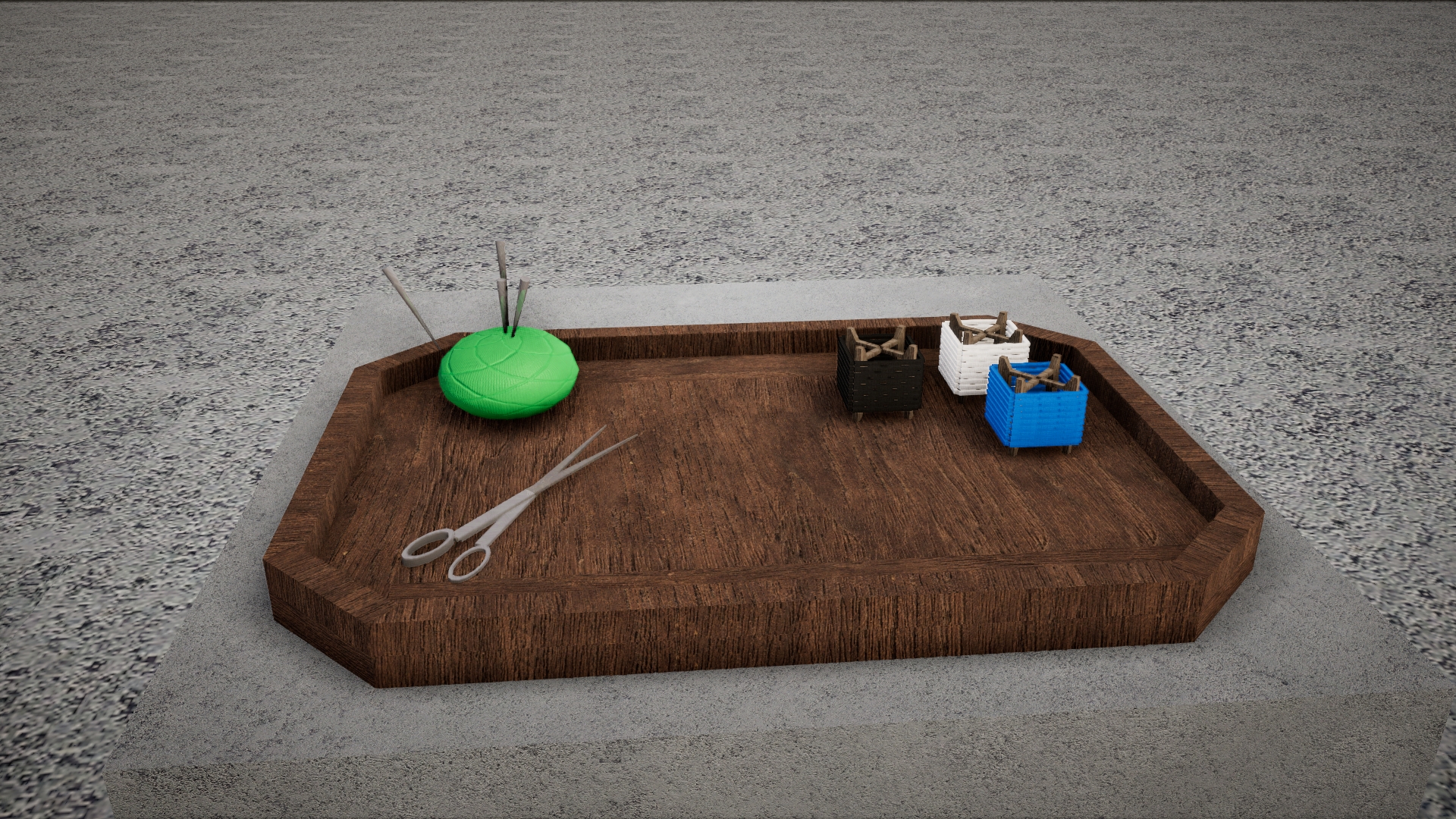 If you scale the window frames to 1.0 x 1.4 x .2 and place them on the ground standing up next to the bench it looks like forms for making different clay tiles, bricks, etc.
