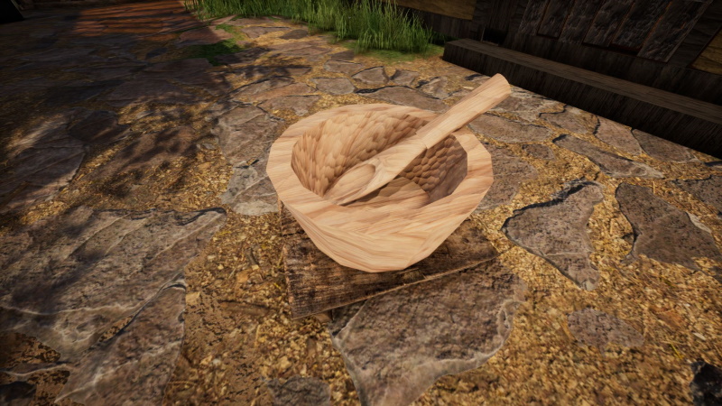 Für eine bessere Immersion habe ich für das Herstellen von Brot- und Keksteig eine kleine Küchen-Werkbank erstellt, die als Tablett für eine Schüssel und einen Holzlöffel dient. Wahrscheinlich wird das in Zukunft überflüssig sein, aber für den Moment finde ich es sehr brauchbar, da ich meinen Teig nicht an einer Handwerkerbank herstellen möchte.