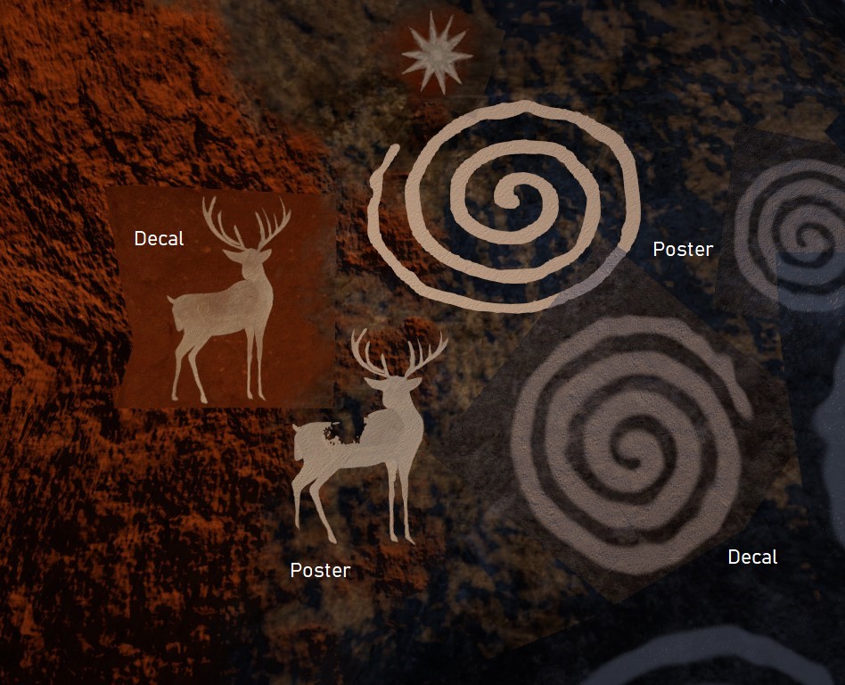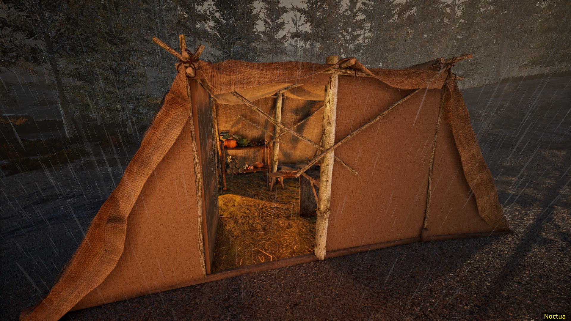Die dekorierte Version enthält drei Schlafplätze, Sitzplätze und Verstaumöglichkeiten, ein Regal, eine primitive Werkbank als Tisch und ein Lagerfeuer (im Feuerkorb) zum Aufwärmen aber auch Grillen (wenn ein Grillspieß angebracht wird). Um den ersten Hunger zu stillen, liegt etwas Gemüse bereit.