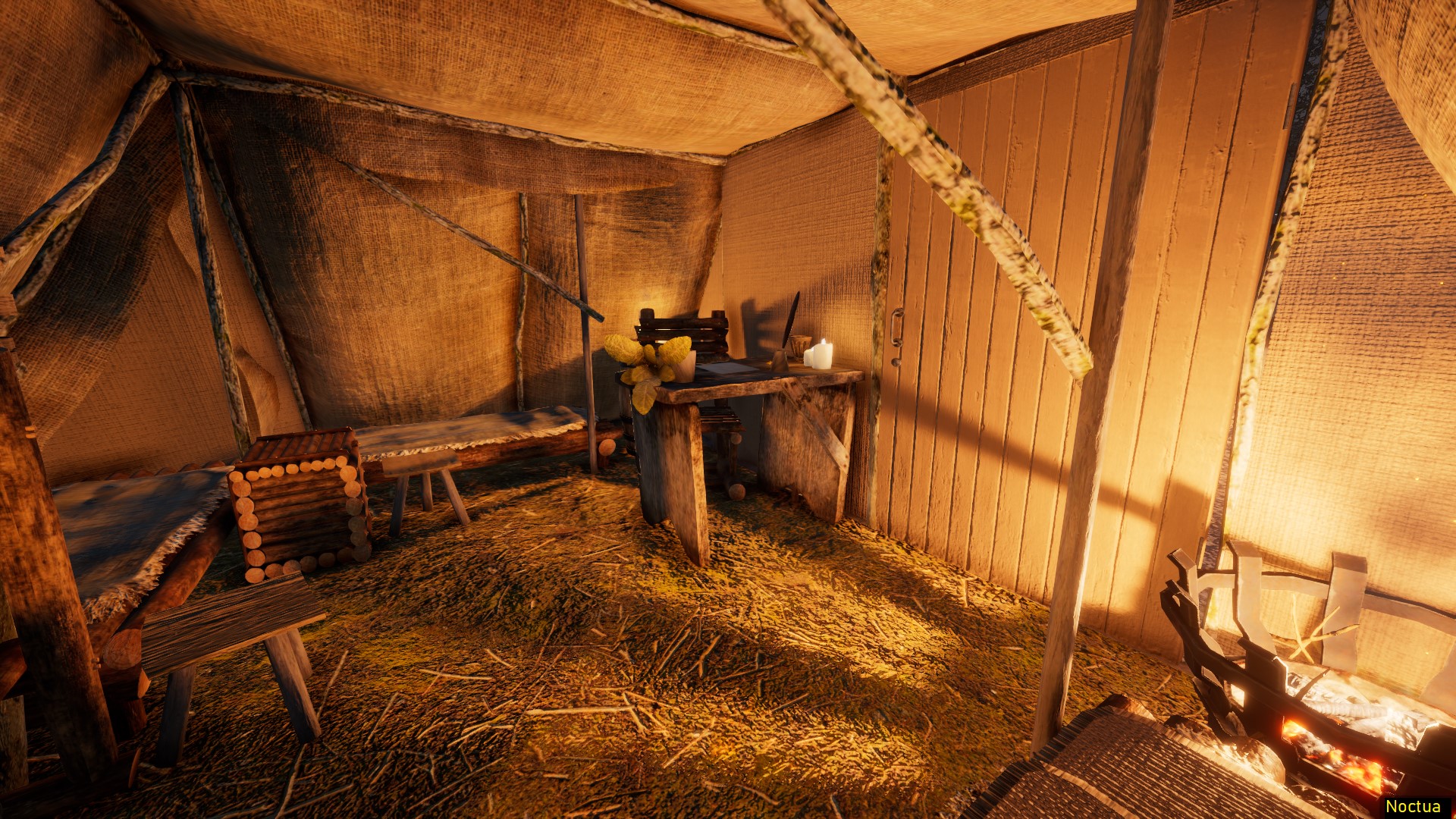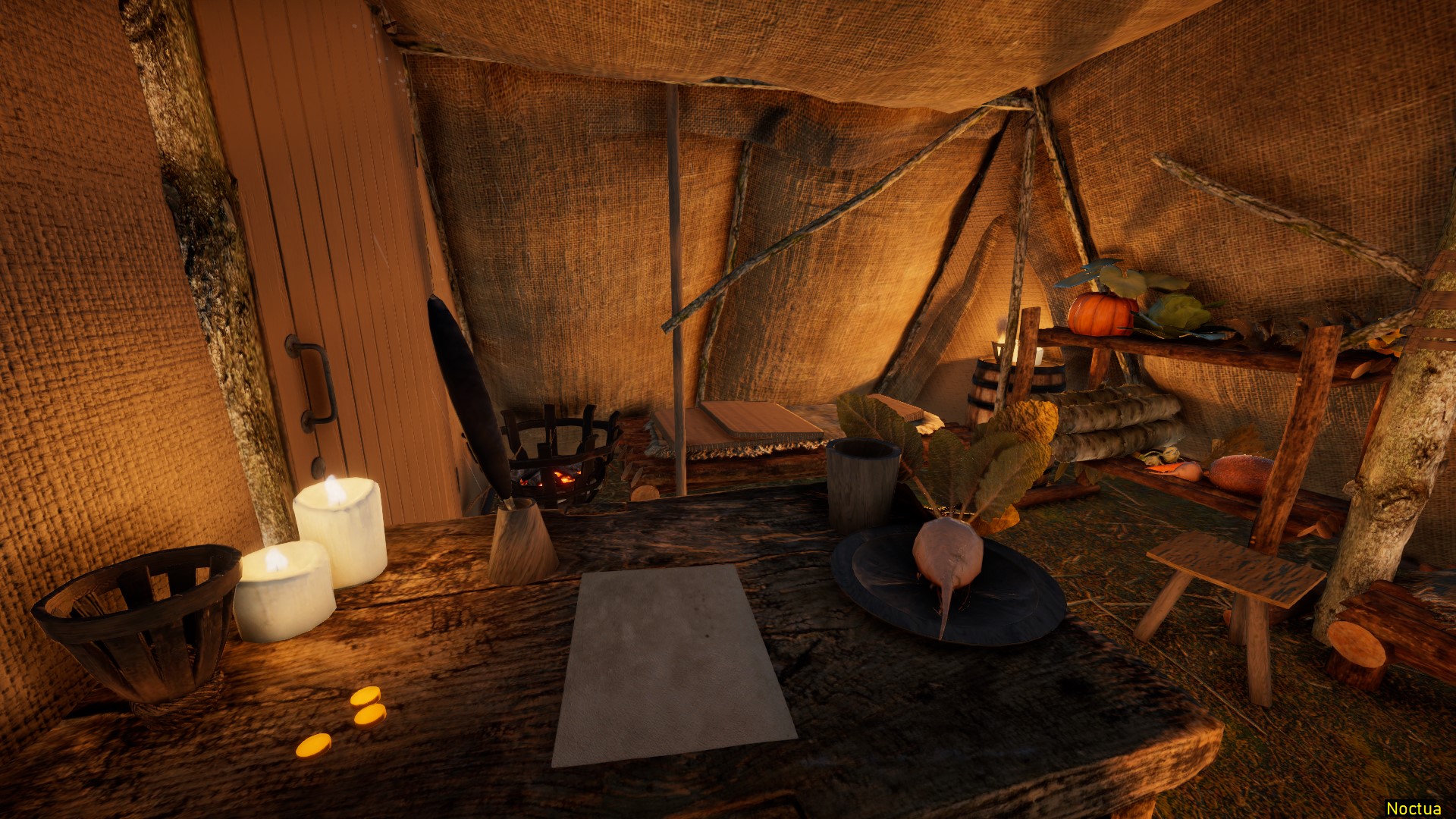 The decorated version adds three beds, seats and storage options, a rack, a primitive workbench as a table and a campfire (in the brazier) to warm up or even grill (if a skewer is mounted). To still the first hunger, there are some vegetables ready to eat.