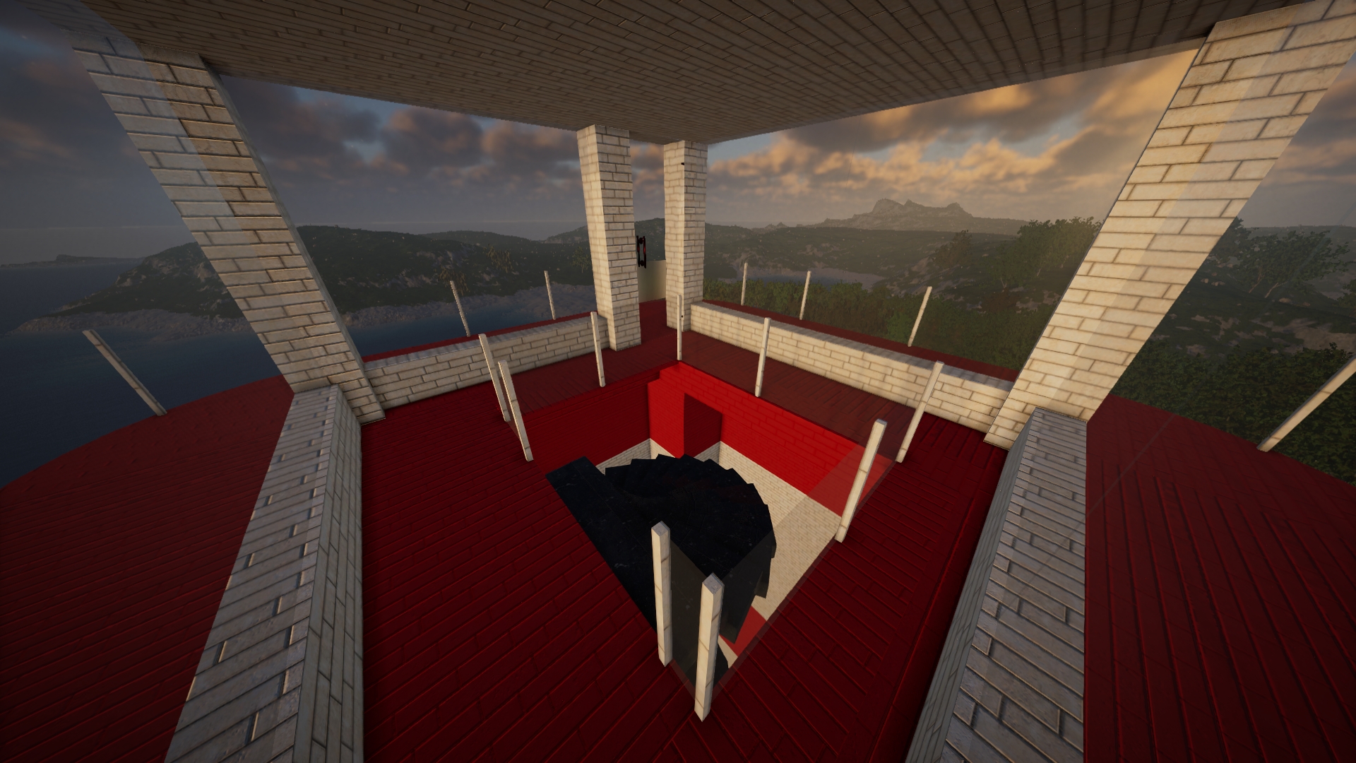 Oben ist eine Glastür die zu einer Aussichtsplattform führt.