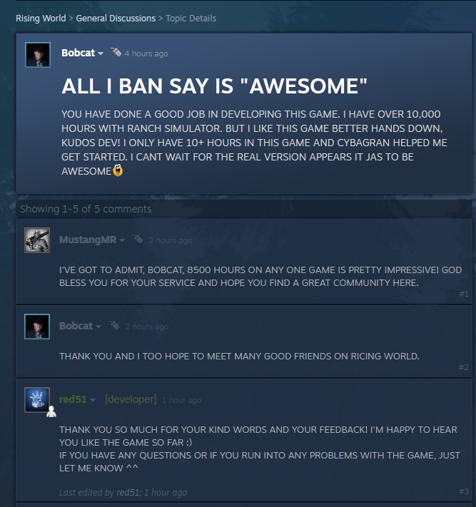 I'm still banned on Steam because of Steam Support Censorship, unable to comment where I would desire to. I attempted to send another ticket, they gave me help which I can't do while banned. They basically told me to go "F*#@ myself". Morons. I'm still lurking on Steam, but I do see what people say. I'm still disappointed in some people in how they keep passing over certain information Red51 himself noted time and again, still confused on many topics and features.