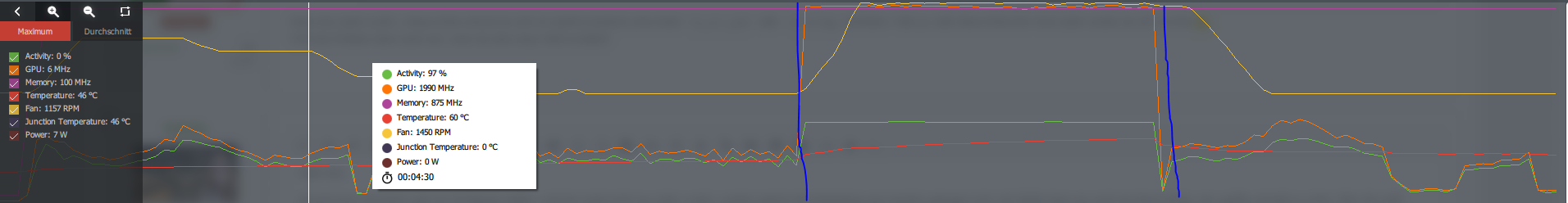 Andere Spiele gehen ohne jede Probleme und sind bei höchster Auflösung problemlos spielbar. Nur RW will einfach nicht zufriedenstellend funktionieren. Von der AMD Aufzeichnung habe ich mal einen Screenshot hochgeladen. Die blauen senkrechten Striche (naja :P) habe ich selbs reingemacht und zeigen wie es mit V-Sync, dann ohne und dann wieder mit verläuft.